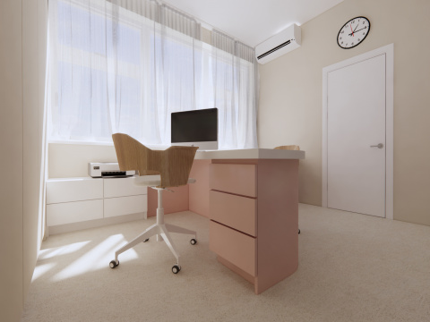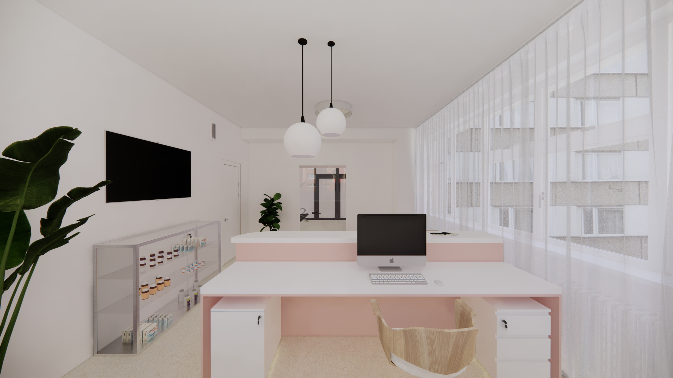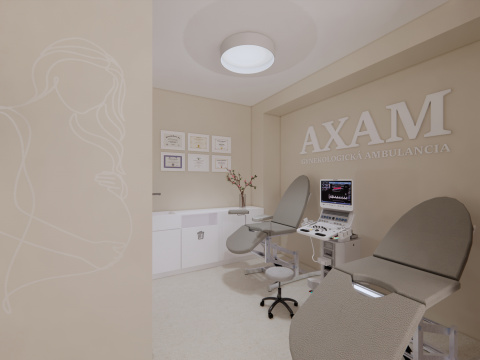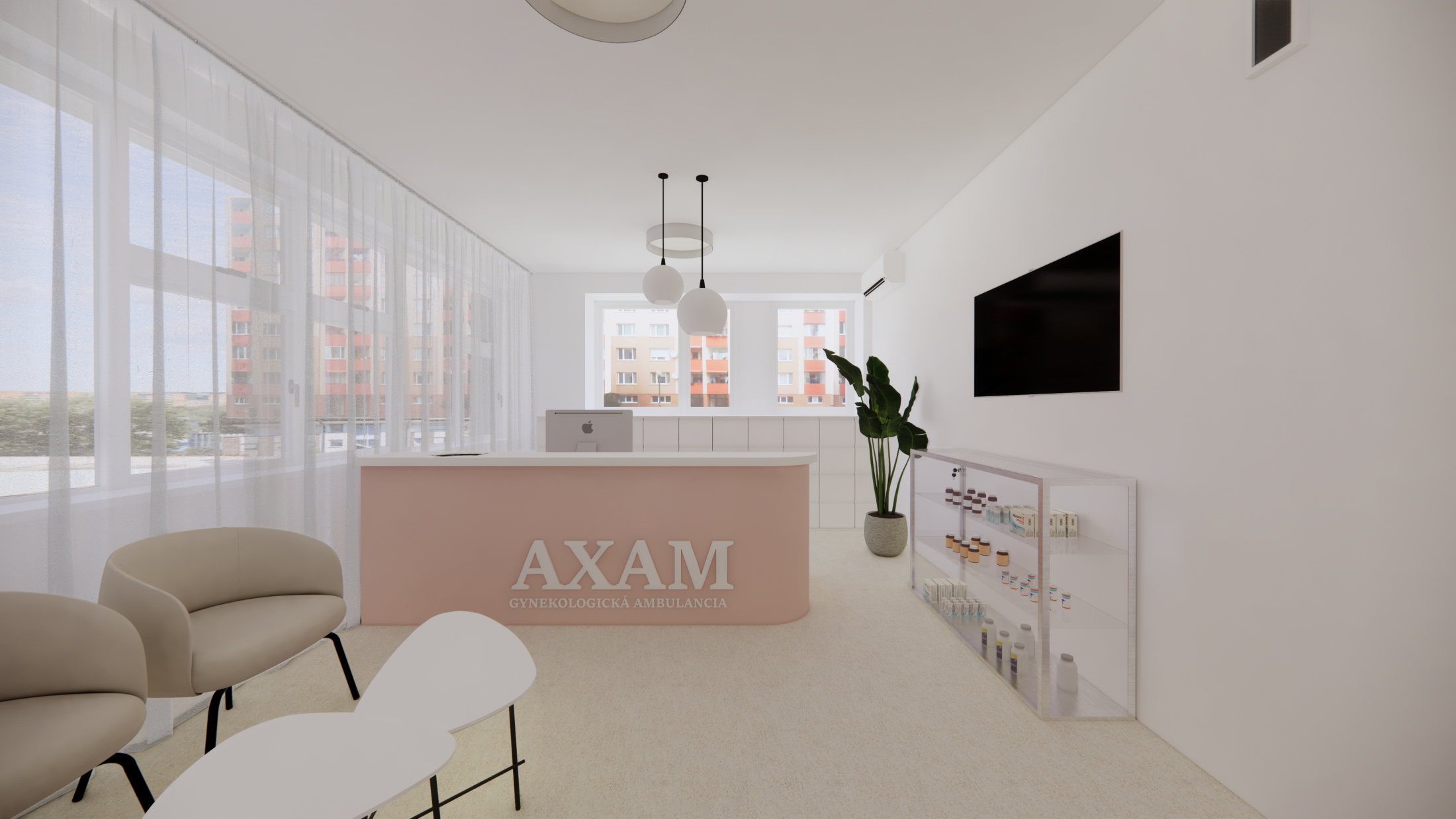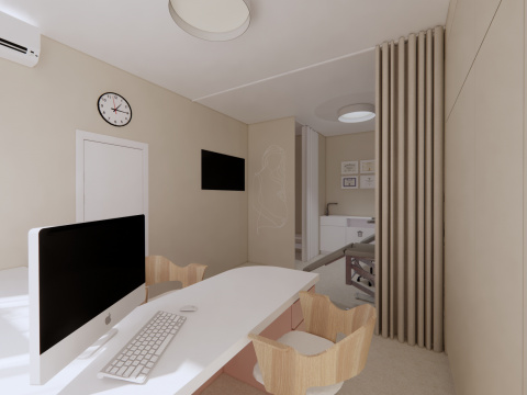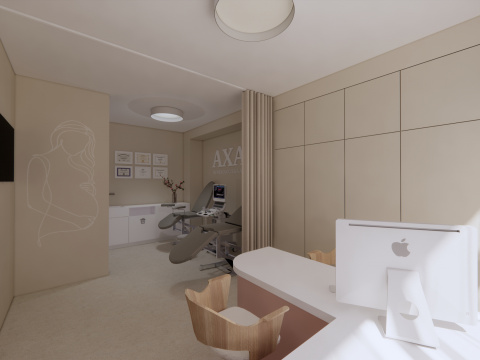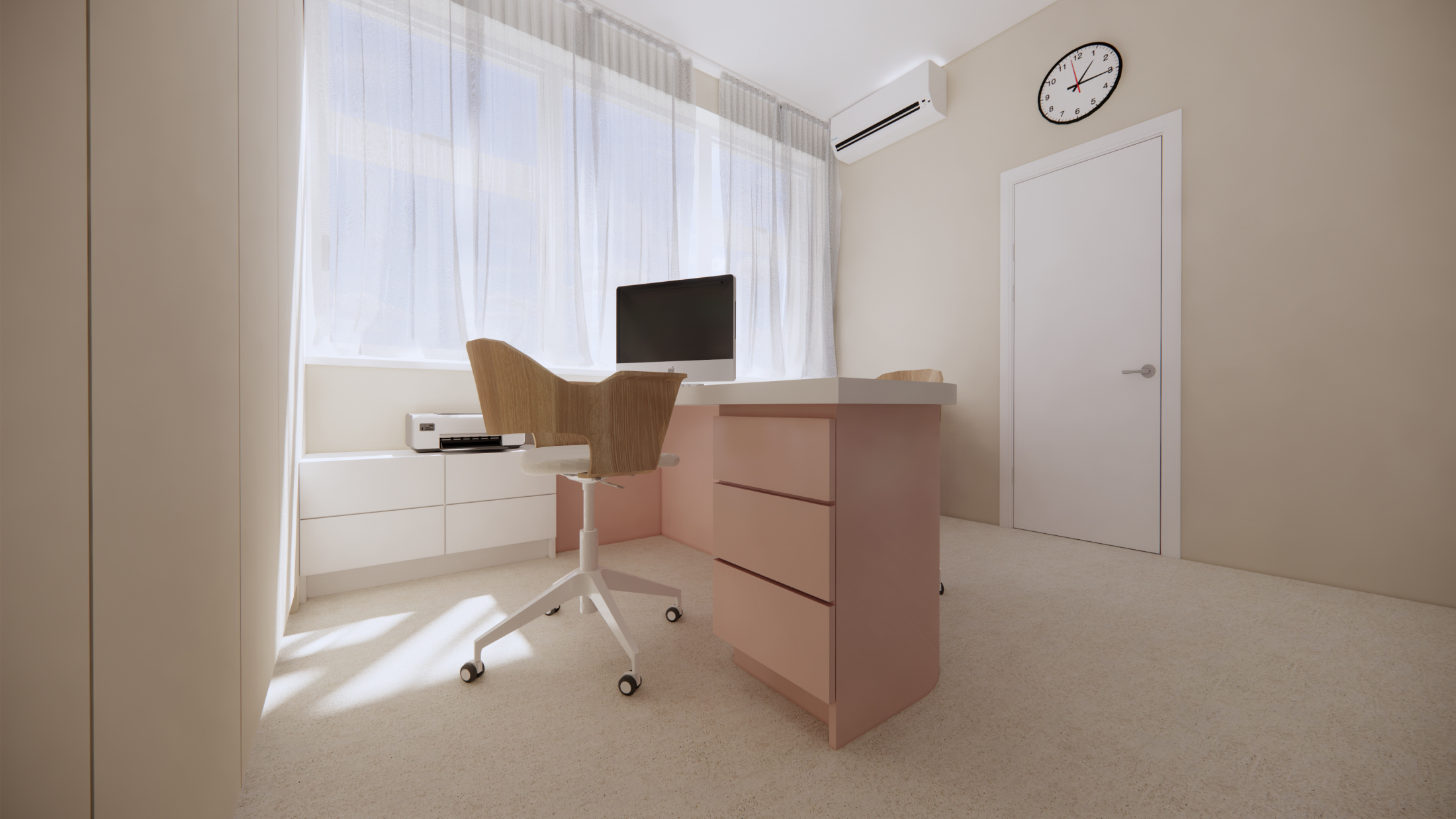 Návrh rieši interiér gynekologickej ambulancie s dôrazom na vytvorenie príjemného a dôverného prostredia pre pacientky. Priestor je rozdelený na zónu pre lekára a sestru, pričom dispozícia umožňuje plynulý a funkčný chod ambulancie. Farebnosť v odtieňoch bielej a staroružovej pôsobí jemne, čisto a zároveň vyjadruje ženskosť. Celkový charakter interiéru je moderný, elegantný a upokojujúci.