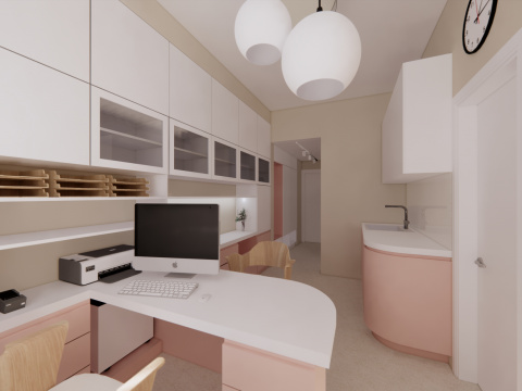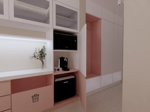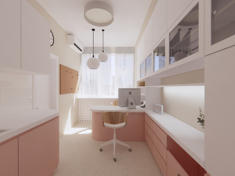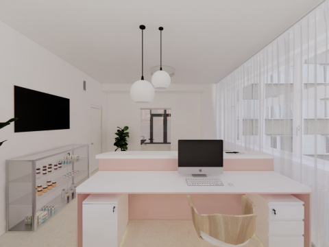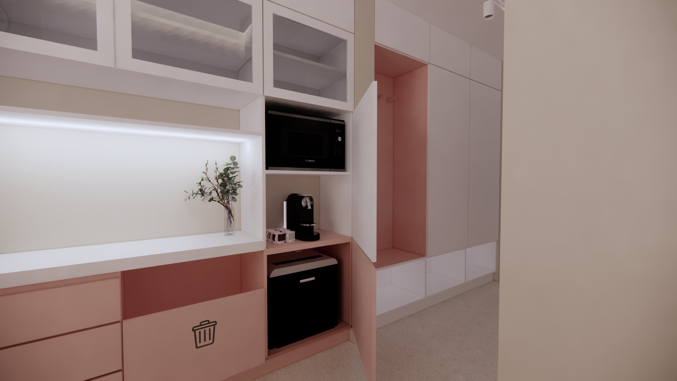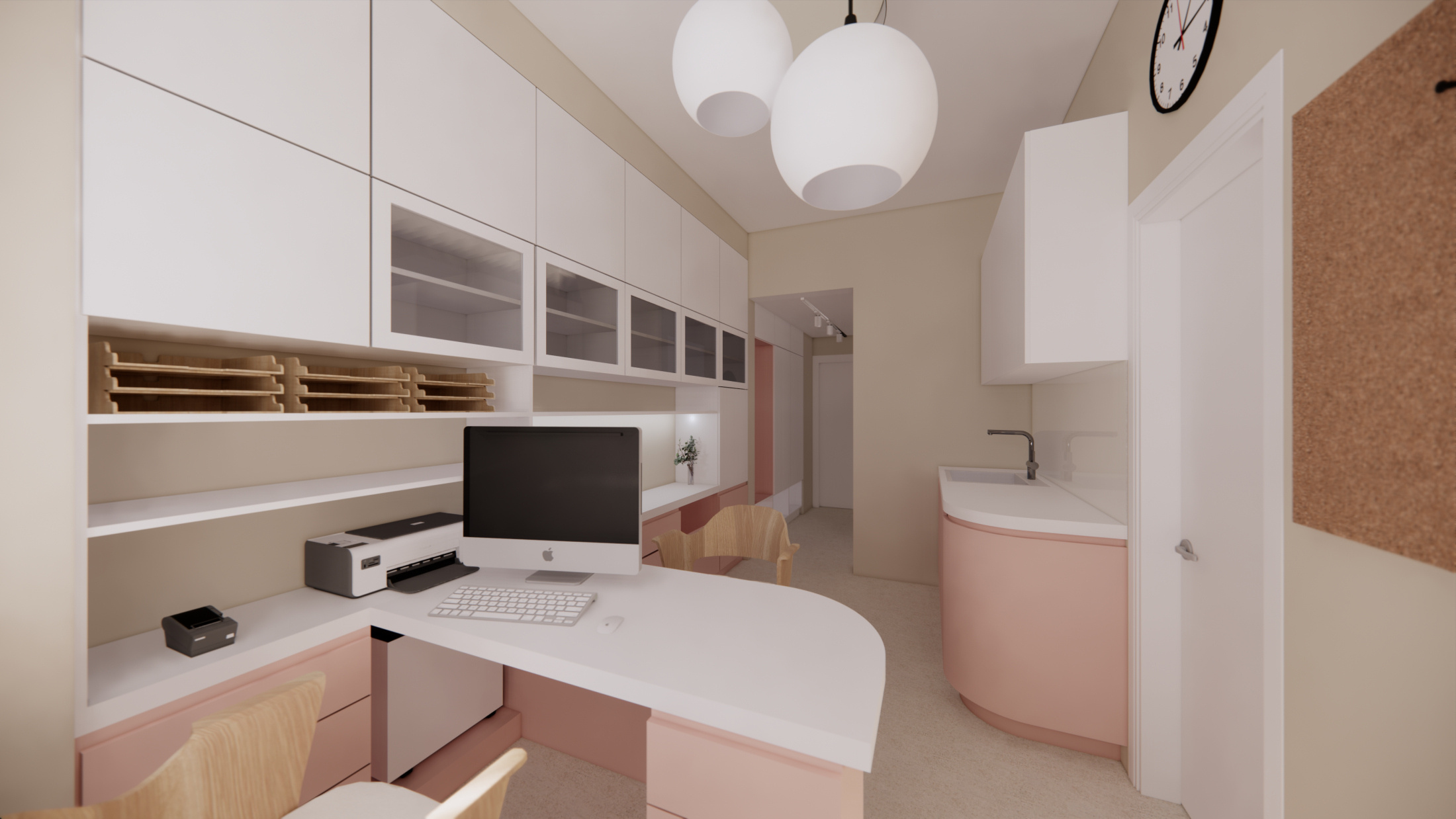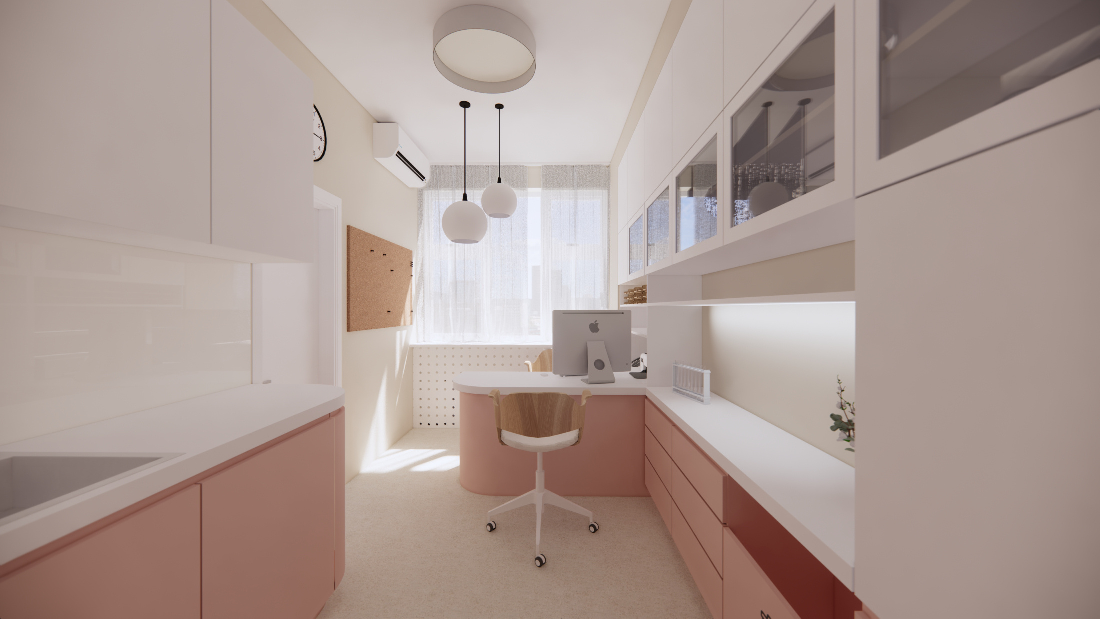 Návrh rieši interiér gynekologickej ambulancie s dôrazom na vytvorenie príjemného a dôverného prostredia pre pacientky. Priestor je rozdelený na zónu pre lekára a sestru, pričom dispozícia umožňuje plynulý a funkčný chod ambulancie. Farebnosť v odtieňoch bielej a staroružovej pôsobí jemne, čisto a zároveň vyjadruje ženskosť. Celkový charakter interiéru je moderný, elegantný a upokojujúci.