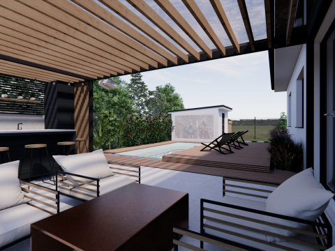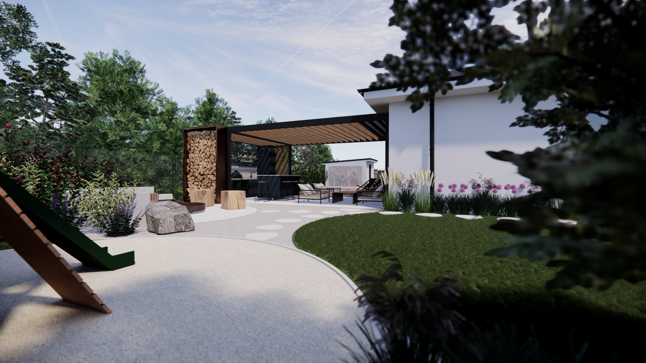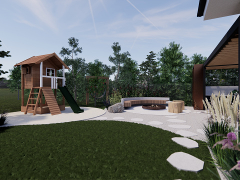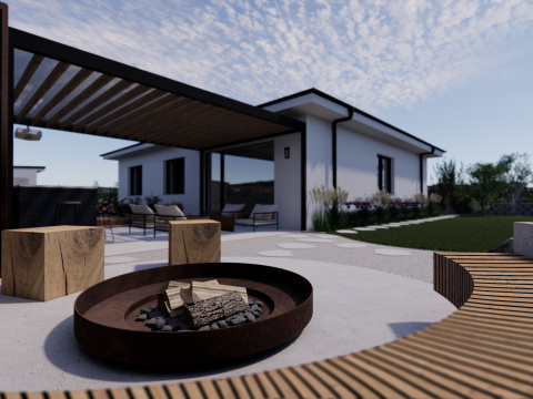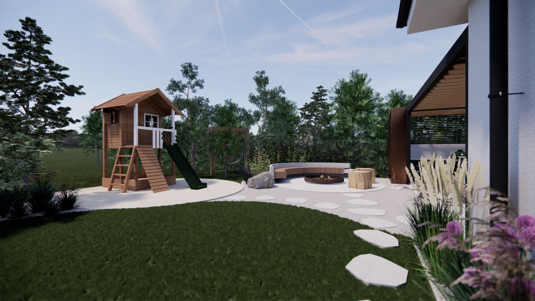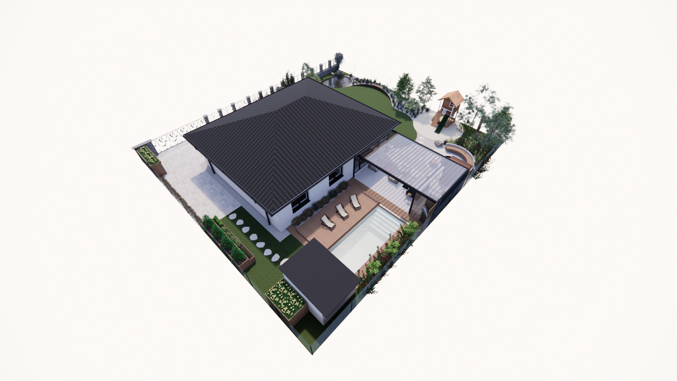 Návrh exteriéru rodinného domu vytvára harmonický a funkčný priestor pre celú rodinu. Súčasťou riešenia je bazén s terasou a prestrešením, chodníky, okrúhle ohnisko, detské ihrisko a domček na náradie. Zeleň dopĺňajú vyvýšené záhony, jazierko a rôzne okrasné výsadby, ktoré prinášajú do záhrady prirodzenosť a pokoj. Celkový návrh spája estetiku s praktickosťou a ponúka príjemné miesto na oddych aj spoločné chvíle.