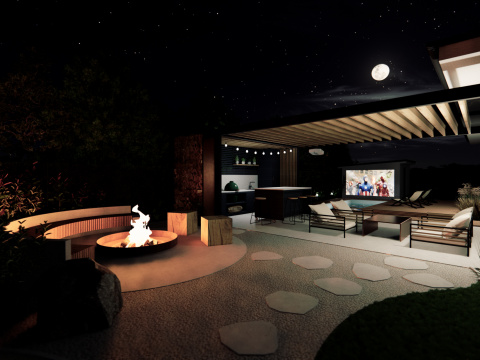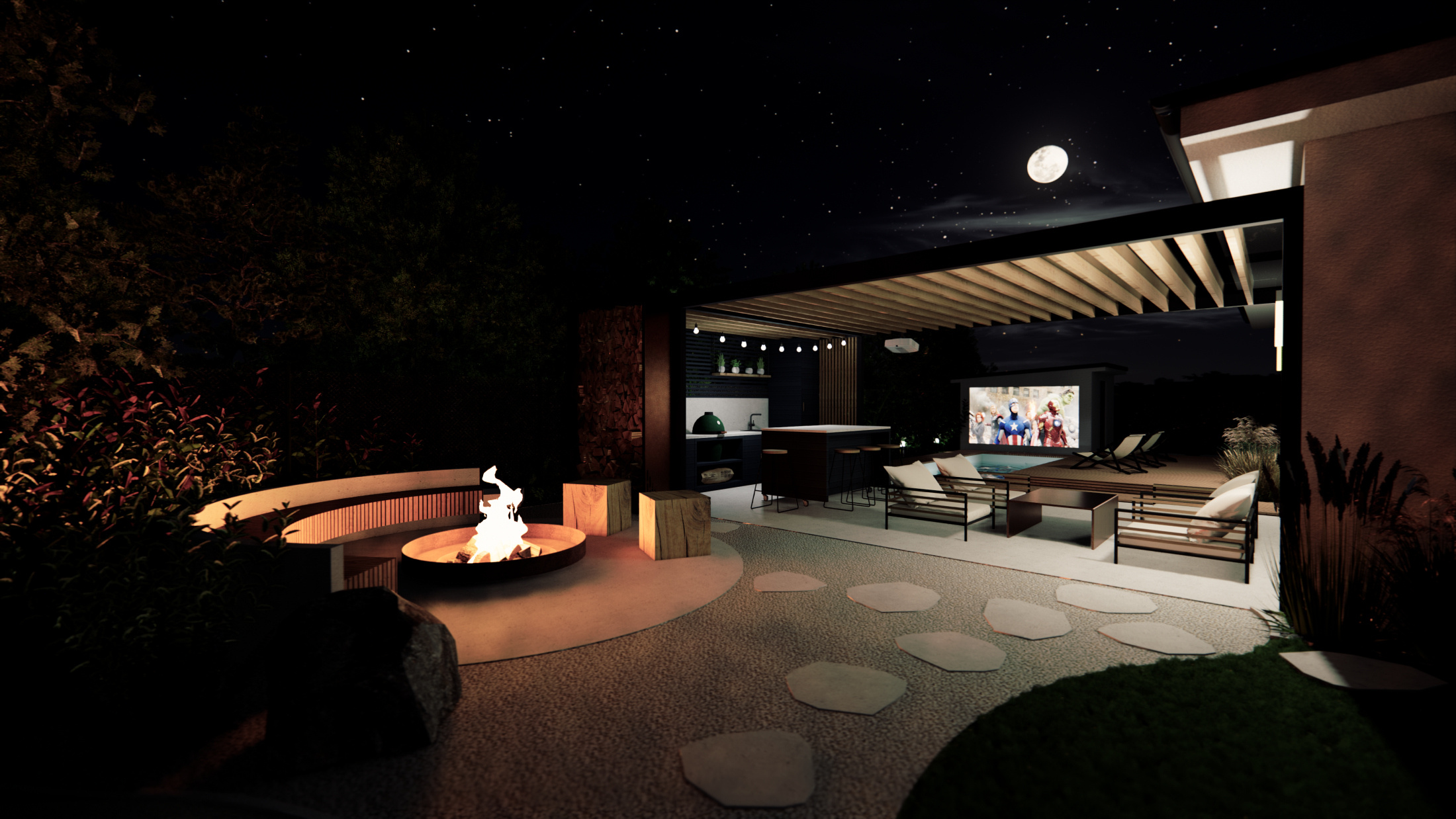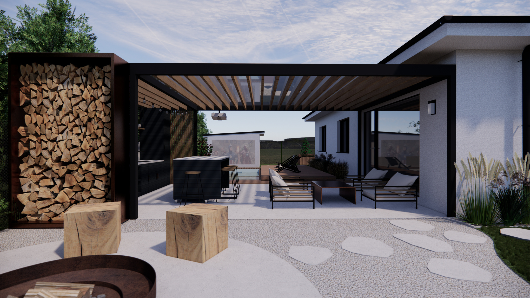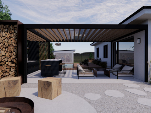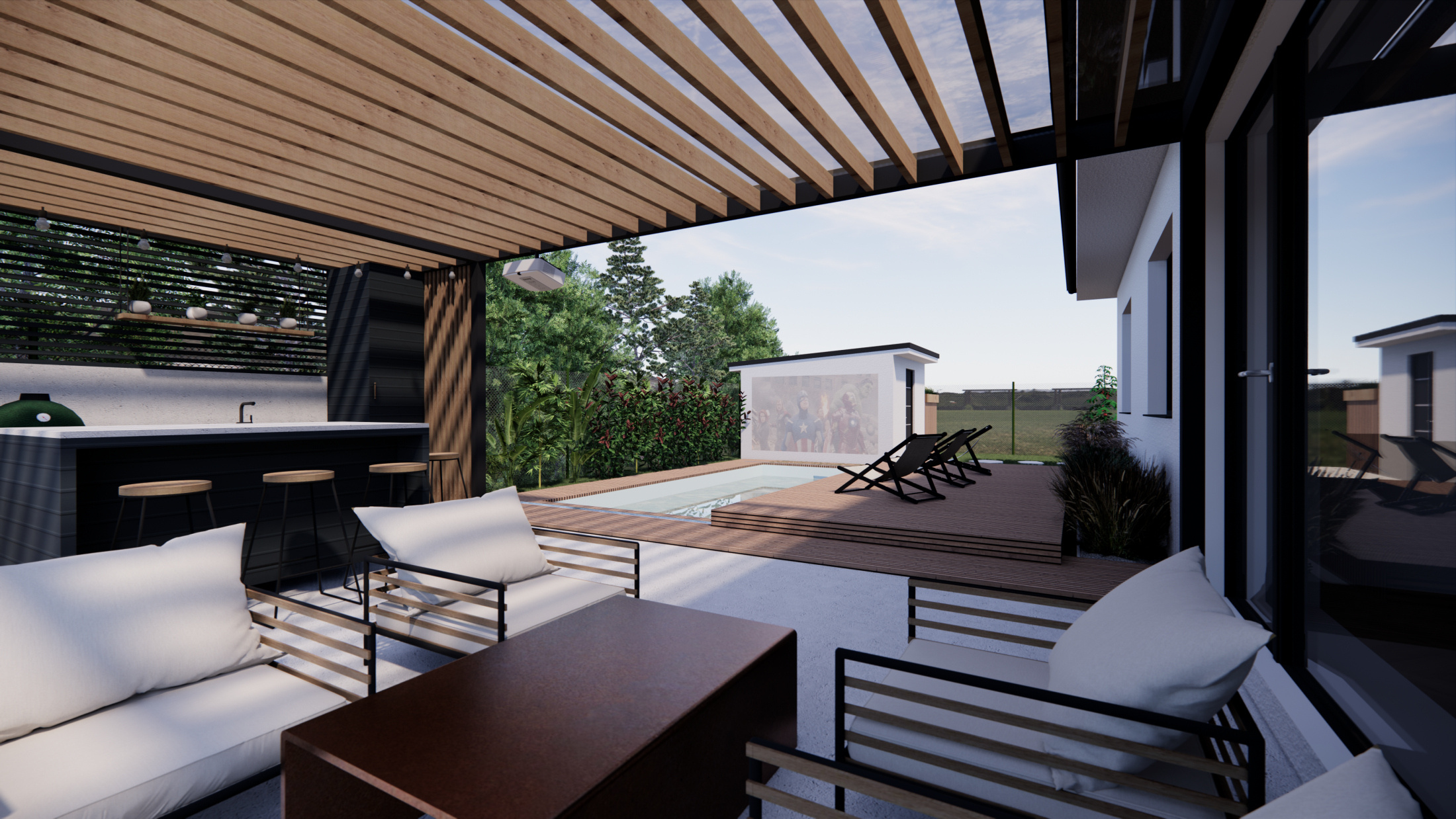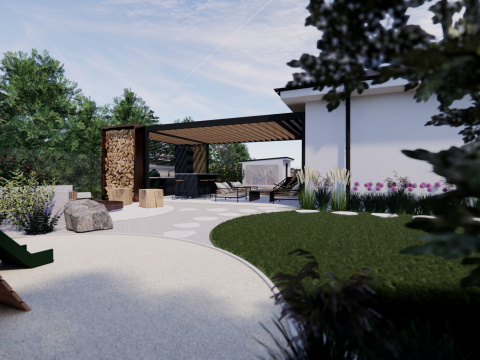 Návrh exteriéru rodinného domu vytvára harmonický a funkčný priestor pre celú rodinu. Súčasťou riešenia je bazén s terasou a prestrešením, chodníky, okrúhle ohnisko, detské ihrisko a domček na náradie. Zeleň dopĺňajú vyvýšené záhony, jazierko a rôzne okrasné výsadby, ktoré prinášajú do záhrady prirodzenosť a pokoj. Celkový návrh spája estetiku s praktickosťou a ponúka príjemné miesto na oddych aj spoločné chvíle.