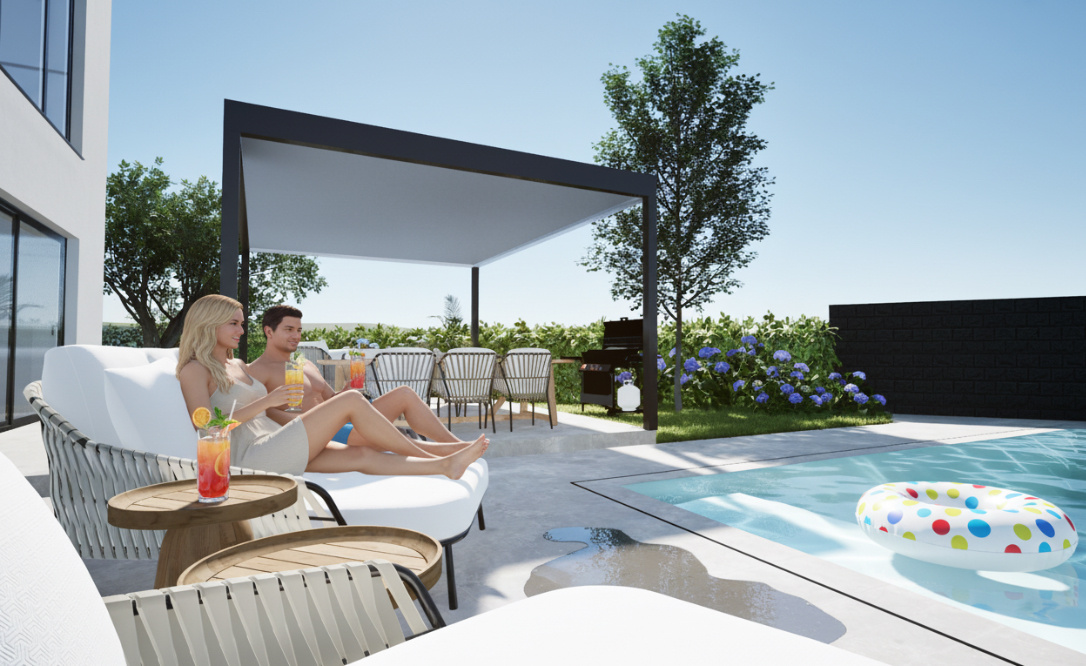 Návrh exteriéru rodinného domu zahŕňa bazén, terasu a chodníky z travertínovej dlažby, doplnené o bioklimatickú pergolu a záhradný domček. Zeleň tvorí trávnik, okrasné trávy, hortenzie a tri stromy albízie. Všetky prvky sú rozmiestnené tak, aby spolu vytvárali harmonické a príjemné prostredie pre oddych aj každodenný život.
