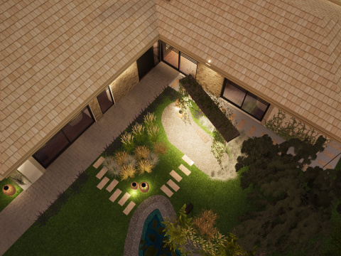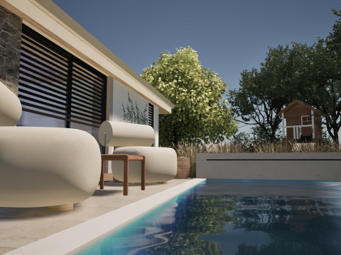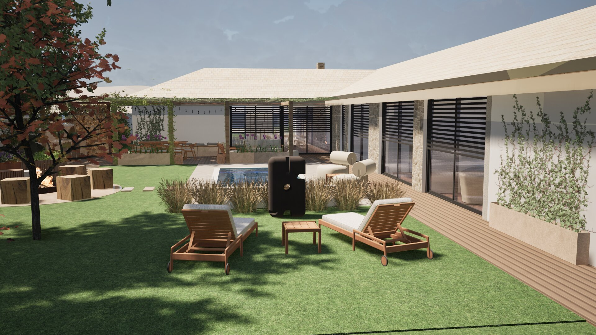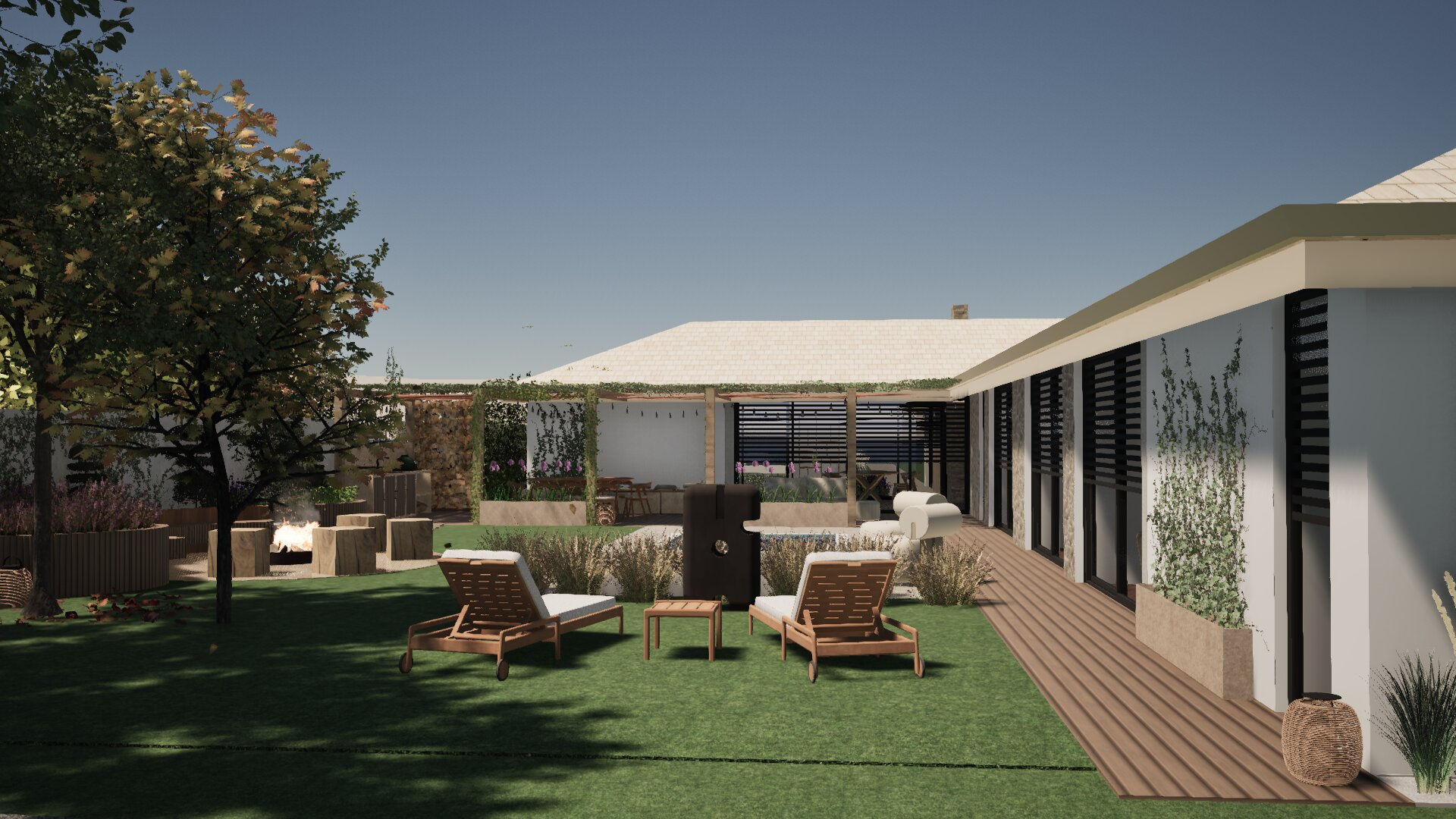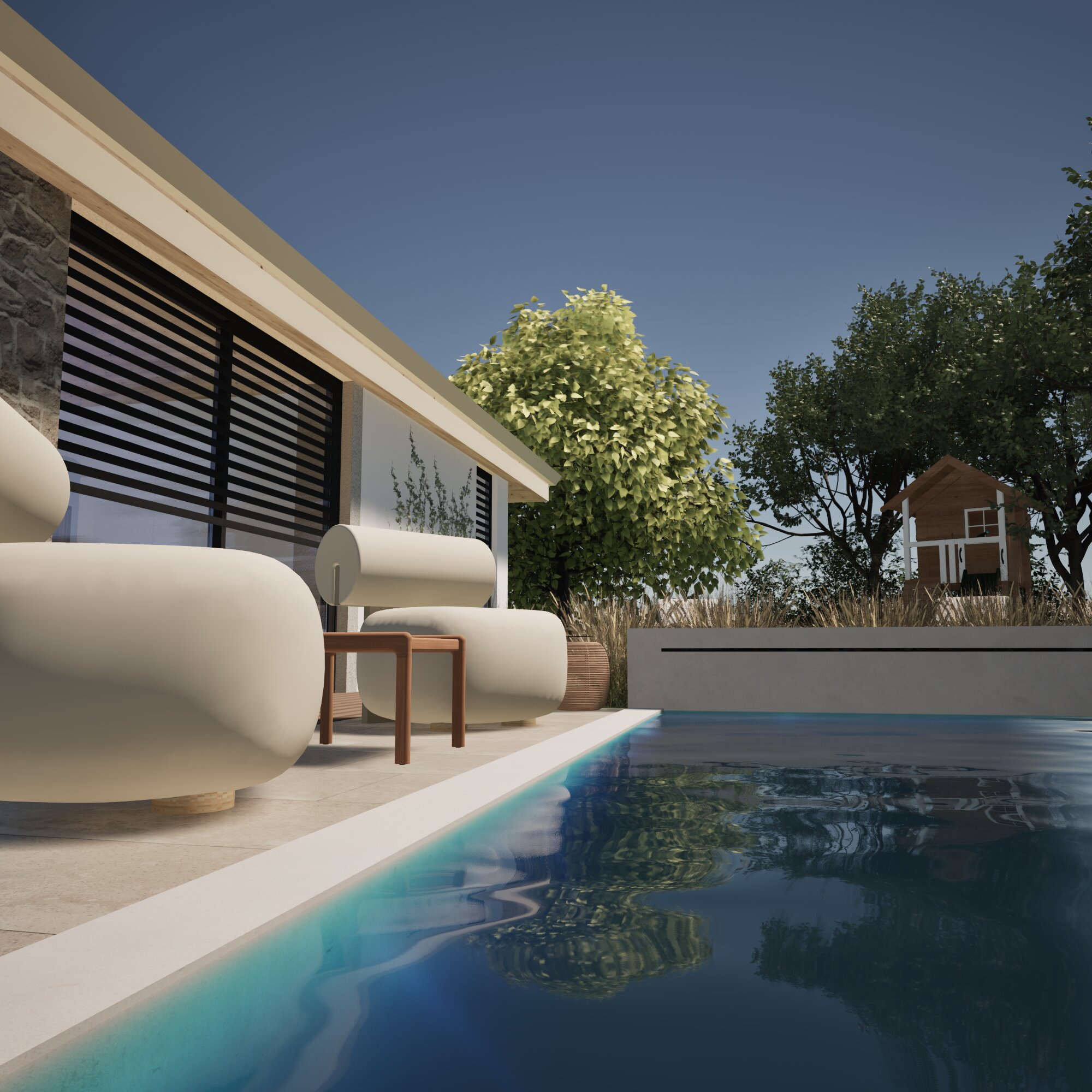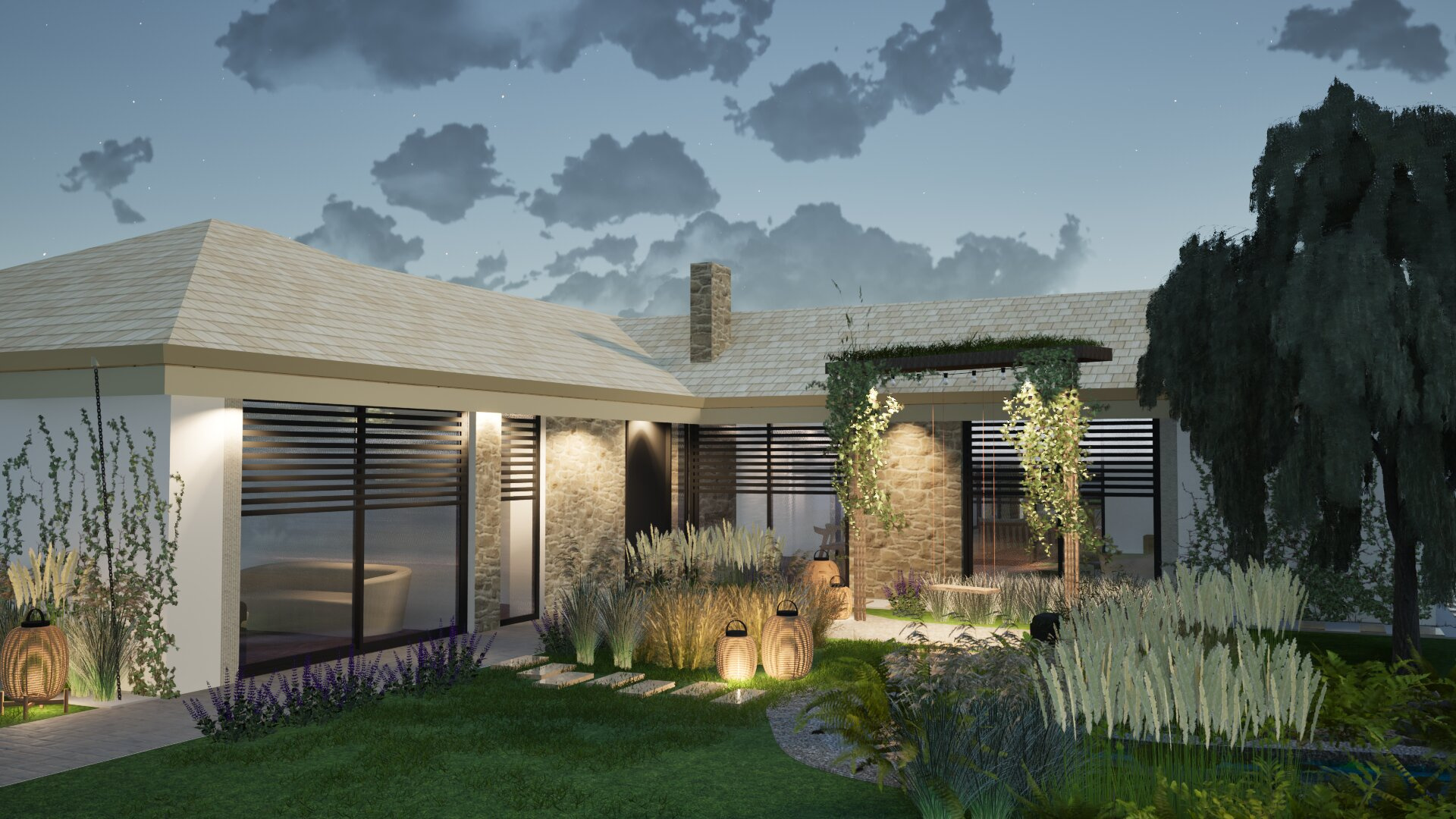 Pri návrhu rodinného domu sme sa zamerali na prepojenie interiéru s exteriérom a vytvorenie harmonického priestoru pre mladú rodinu. Pred domom vznikol prívetivý vstup so sedením, hojdačkou a malým rybníkom, obklopený nenáročnou zeleňou. Súkromná časť pozemku ponúka bazén, terasu s letnou kuchyňou, ohnisko medzi bylinkami a detskú zónu – miesto pokoja a funkčnej estetiky.