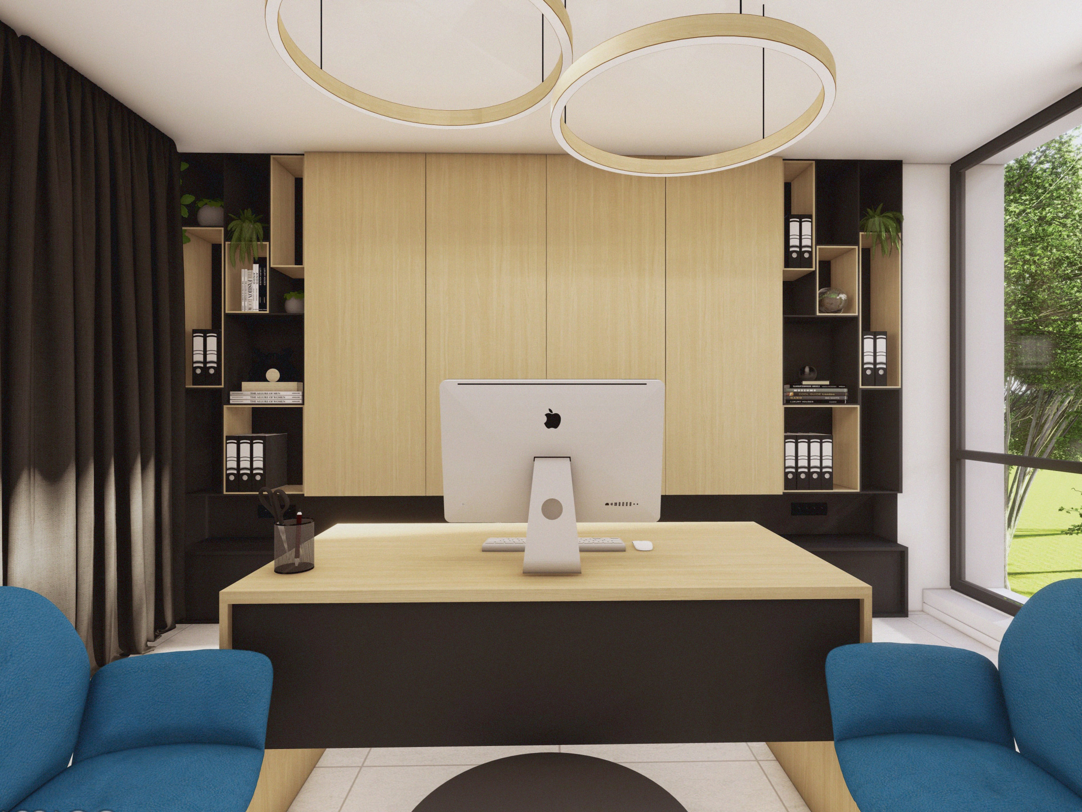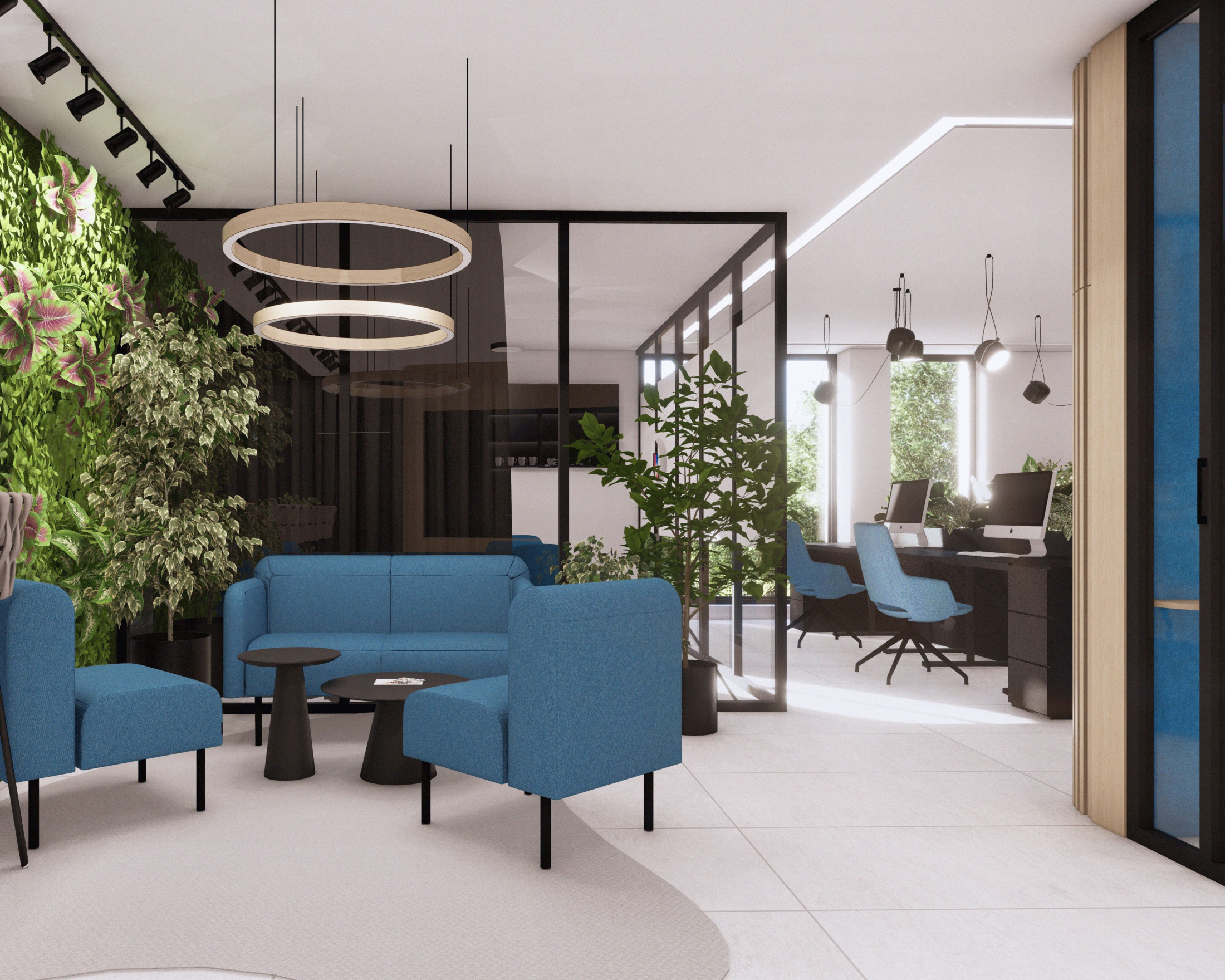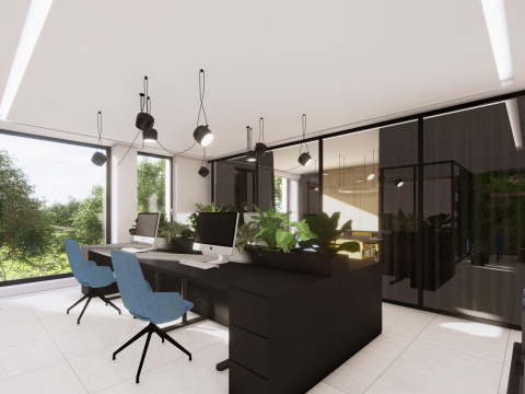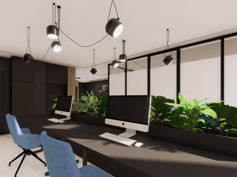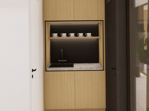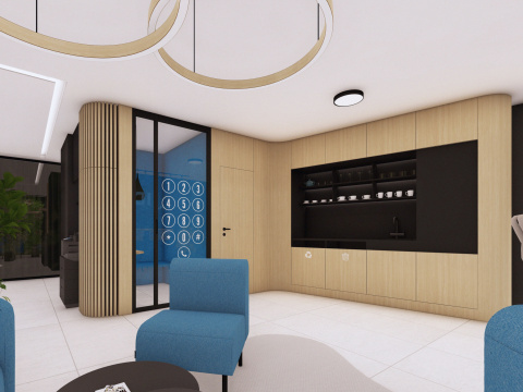 Návrh a realizácia kancelárskych priestorov zahŕňa zasadačku, kuchynku, oddychové posedenie a telefónnu budku. Interiér je riešený v elegantnom a nadčasovom štýle s kombináciou dreva a antracitu, ktoré pôsobia profesionálne a zároveň útulne. Farebné akcenty v modrom a žltom čalúnení vychádzajú z firemného loga a dodávajú priestoru sviežosť a identitu značky. Výsledkom je moderné, harmonické pracovné prostredie podporujúce kreativitu aj komfort.