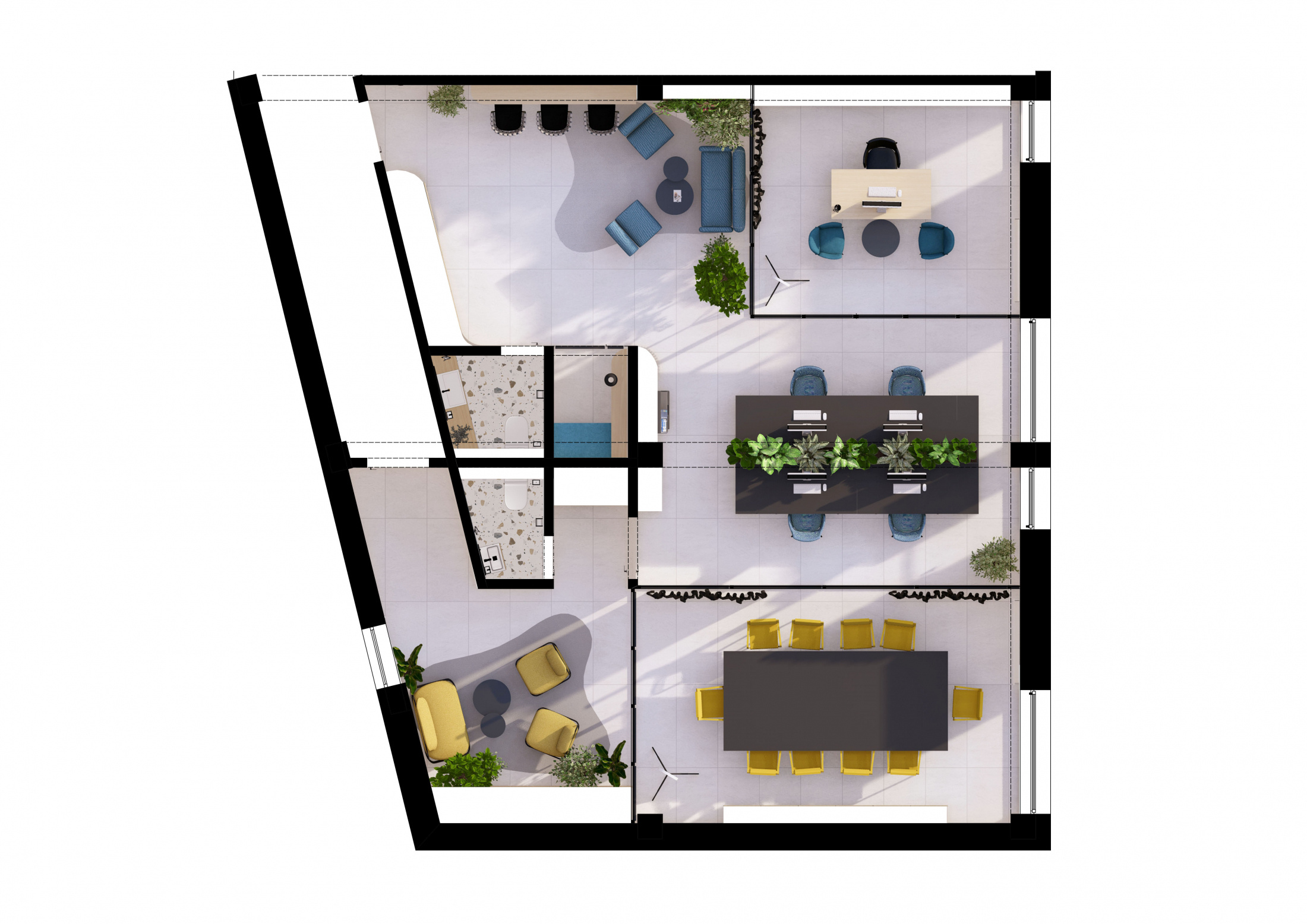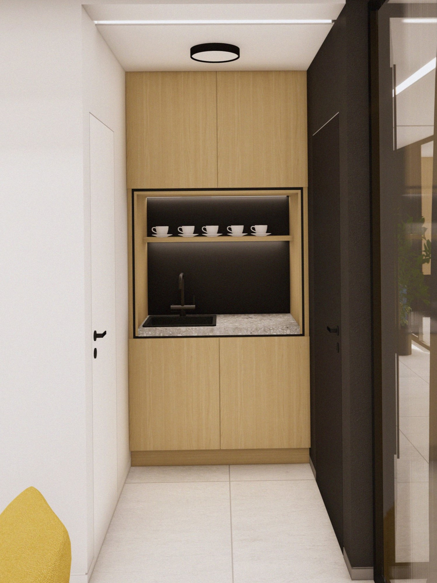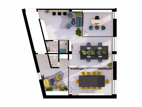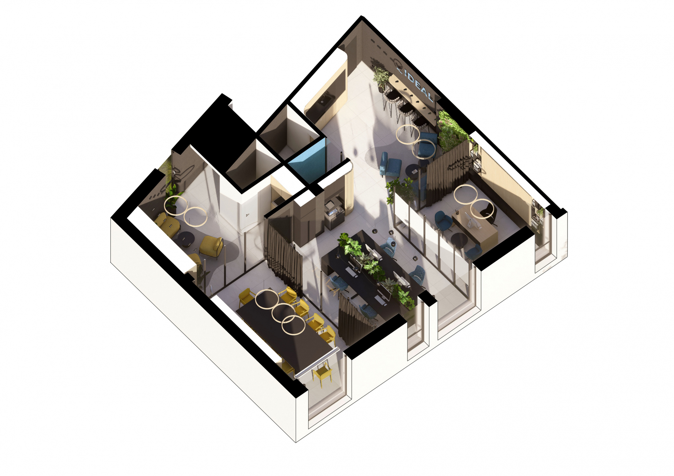 Návrh a realizácia kancelárskych priestorov zahŕňa zasadačku, kuchynku, oddychové posedenie a telefónnu budku. Interiér je riešený v elegantnom a nadčasovom štýle s kombináciou dreva a antracitu, ktoré pôsobia profesionálne a zároveň útulne. Farebné akcenty v modrom a žltom čalúnení vychádzajú z firemného loga a dodávajú priestoru sviežosť a identitu značky. Výsledkom je moderné, harmonické pracovné prostredie podporujúce kreativitu aj komfort.