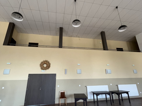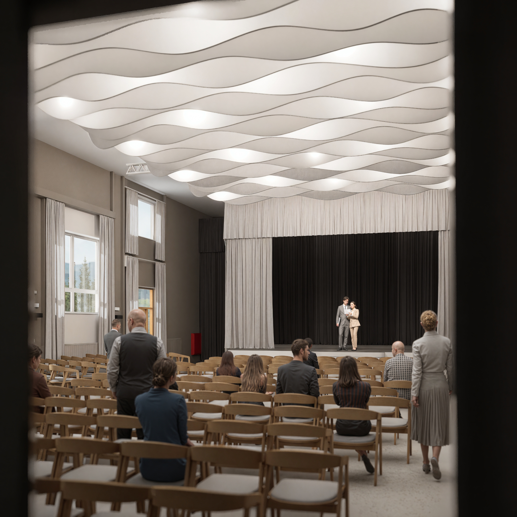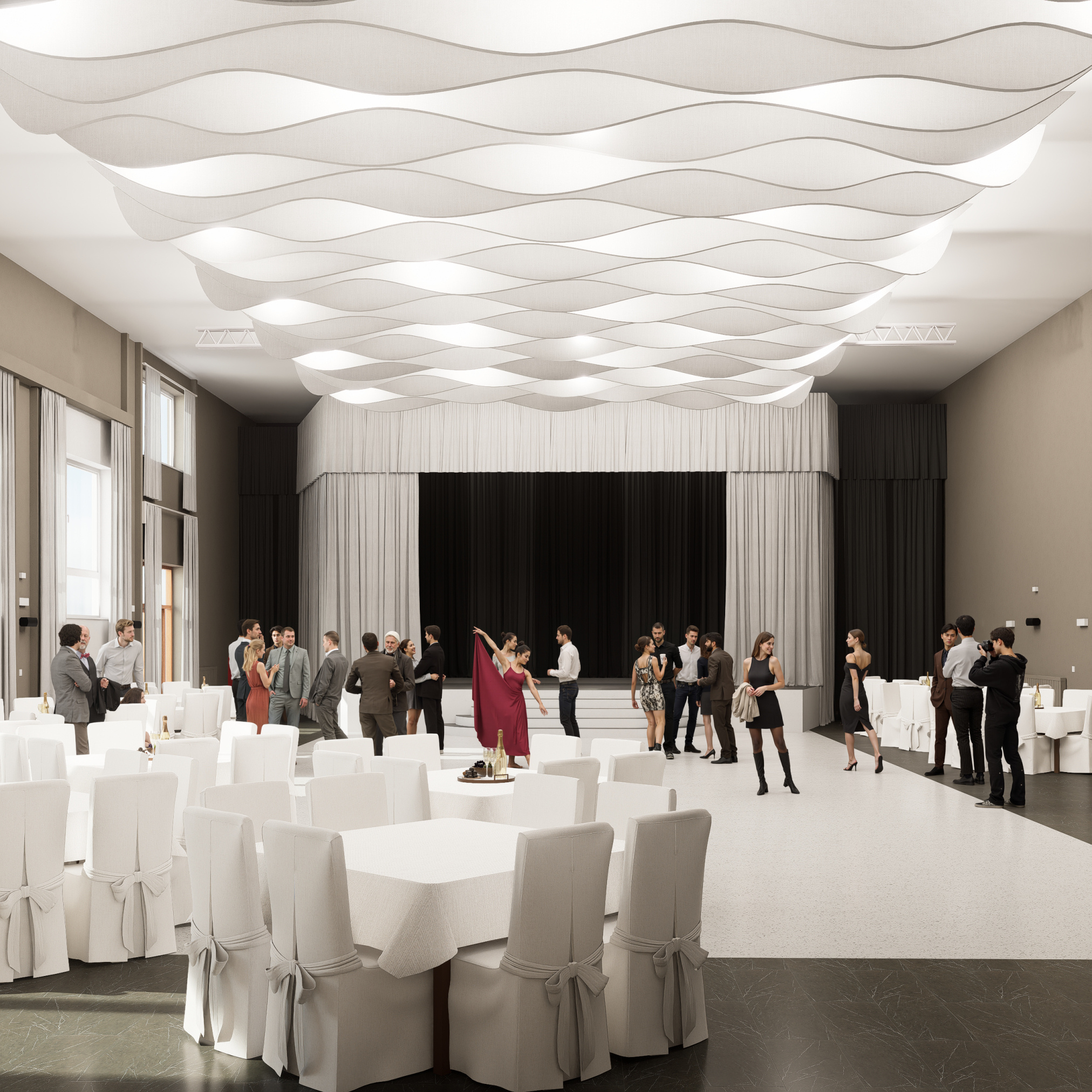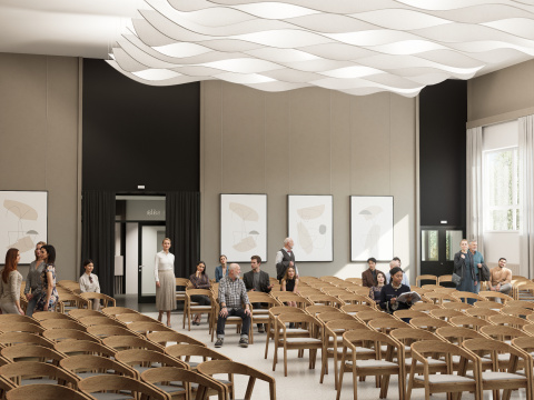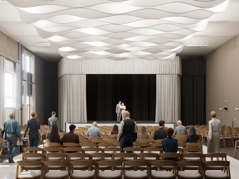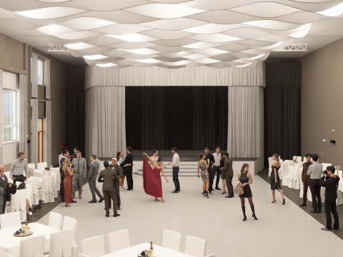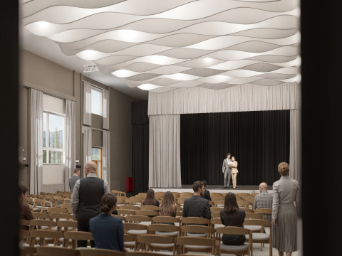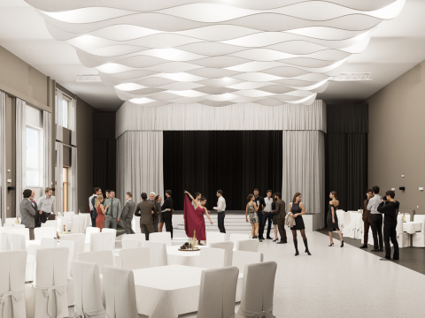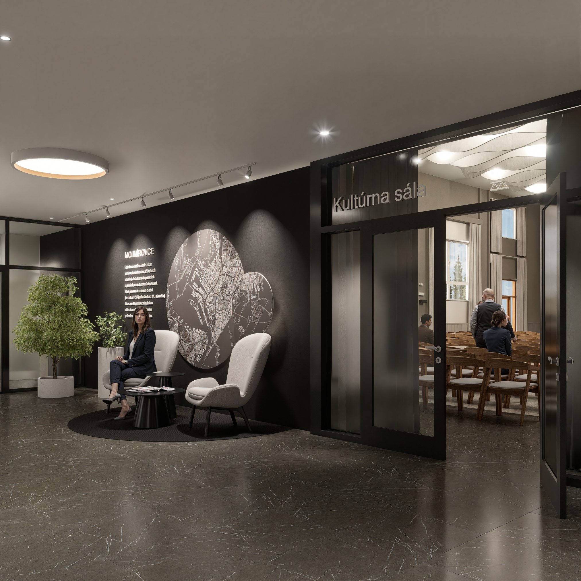 Projekt modernizuje sálu a vstupnú chodbu kultúrneho domu v Mojmírovciach s cieľom vytvoriť reprezentatívne prostredie pre spoločenské podujatia. Vstup doplní zádverie, oddychová zóna so zeleňou a priestorom pre výstavy. Sála získa nový akustický strop, stenu a rozoberateľné pódium s oponou, čím sa prispôsobí rôznym typom podujatí. Celkový návrh prináša moderný, útulný a dôstojný priestor, ktorý spája históriu obce s jej súčasným spoločenským životom.