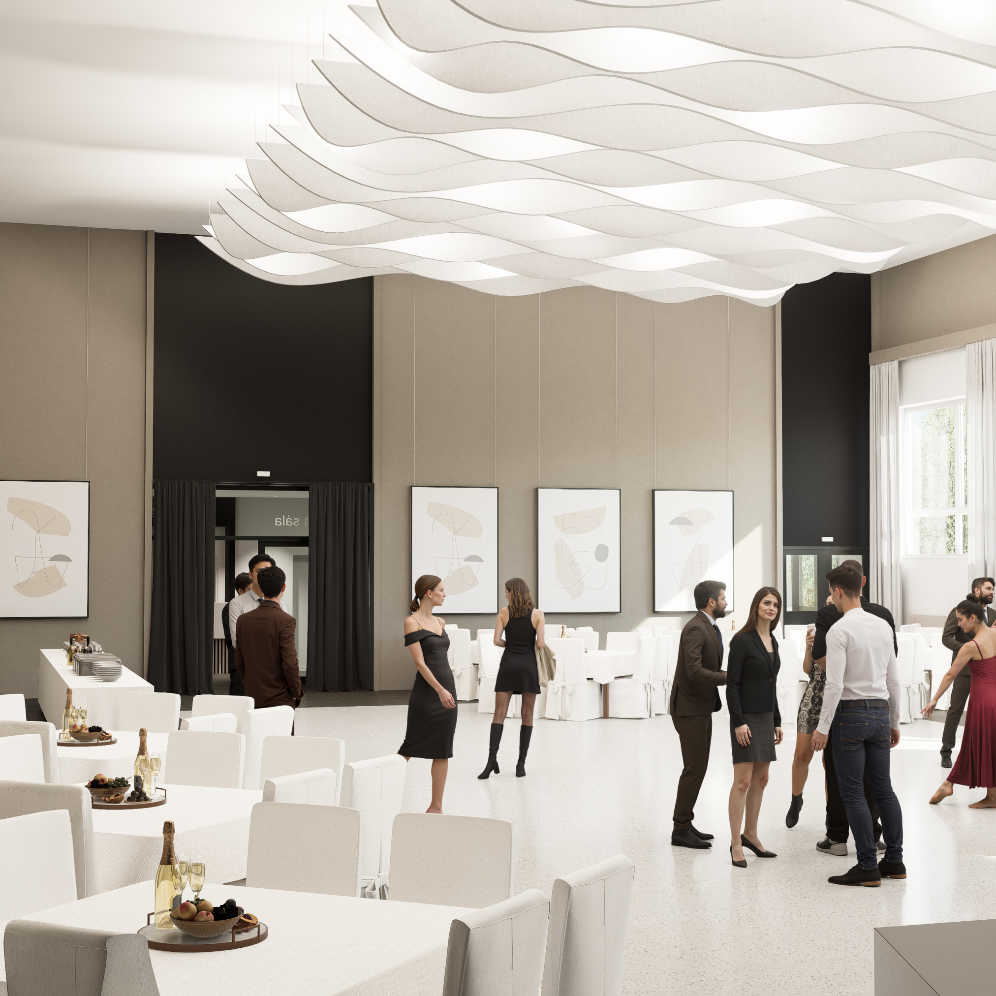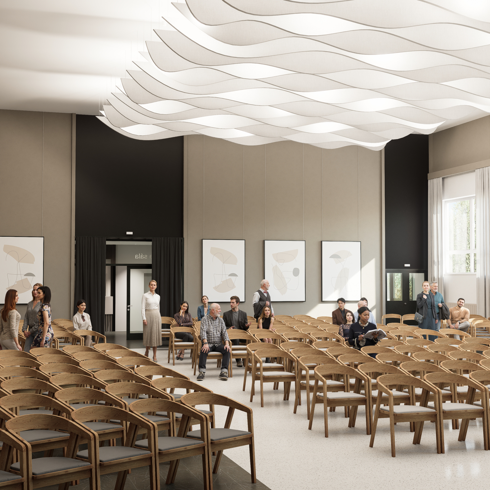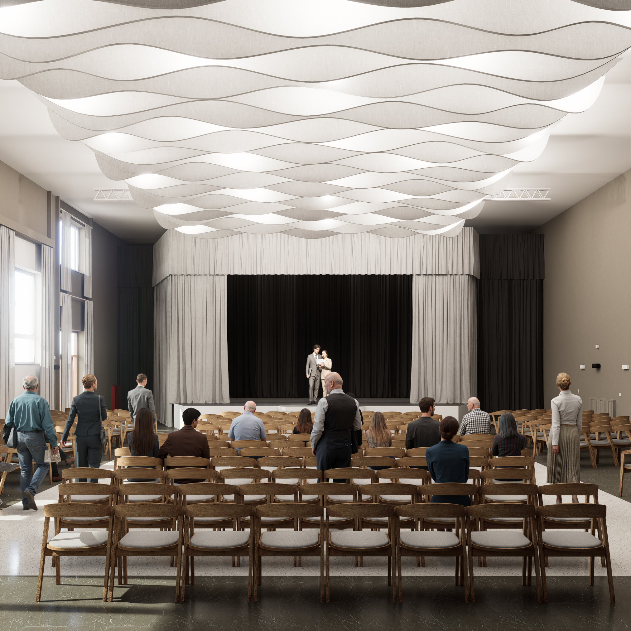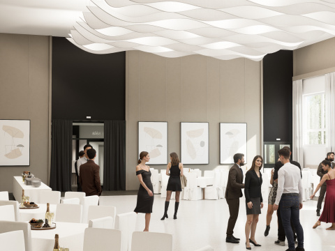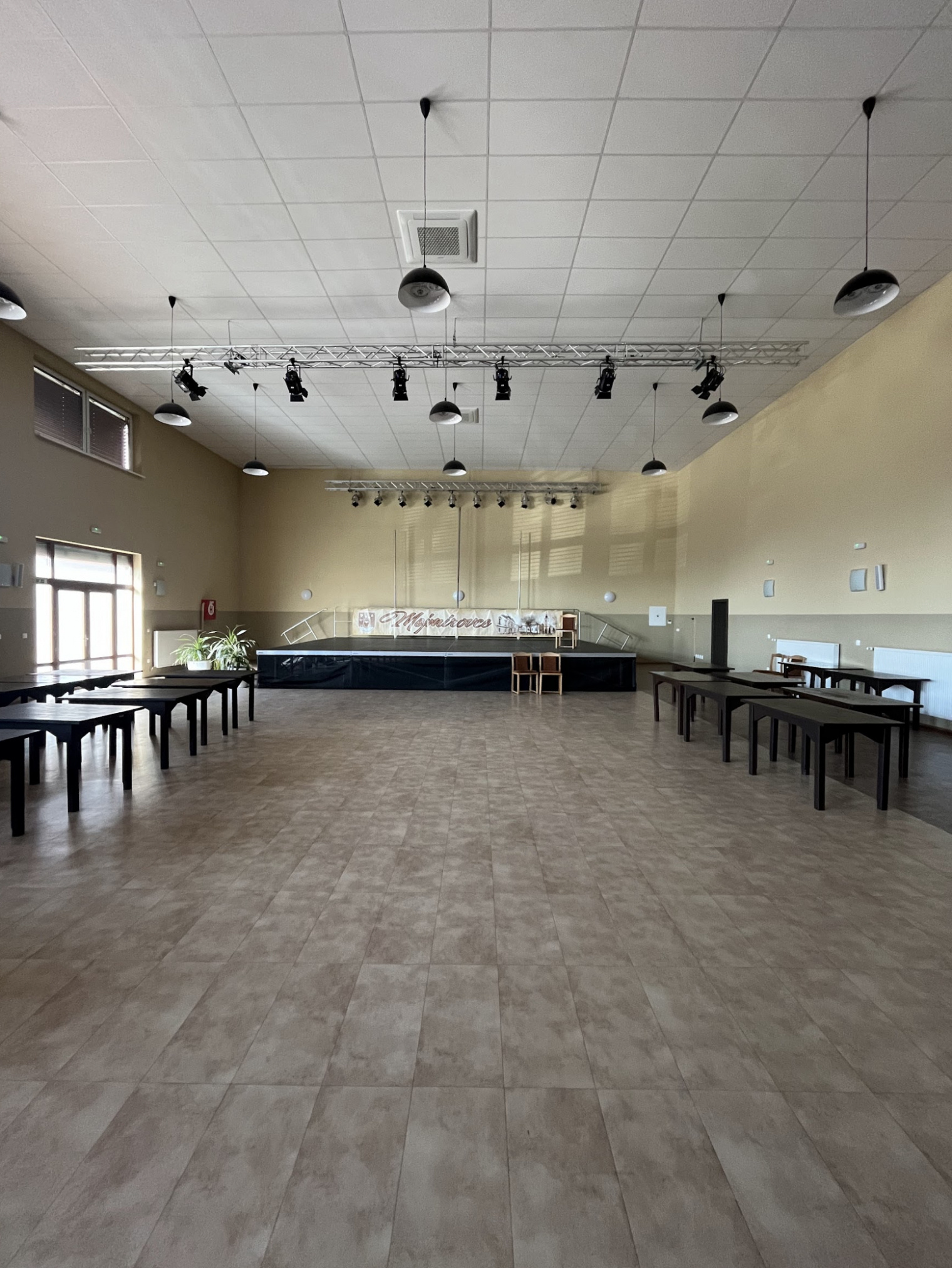 Projekt modernizuje sálu a vstupnú chodbu kultúrneho domu v Mojmírovciach s cieľom vytvoriť reprezentatívne prostredie pre spoločenské podujatia. Vstup doplní zádverie, oddychová zóna so zeleňou a priestorom pre výstavy. Sála získa nový akustický strop, stenu a rozoberateľné pódium s oponou, čím sa prispôsobí rôznym typom podujatí. Celkový návrh prináša moderný, útulný a dôstojný priestor, ktorý spája históriu obce s jej súčasným spoločenským životom.