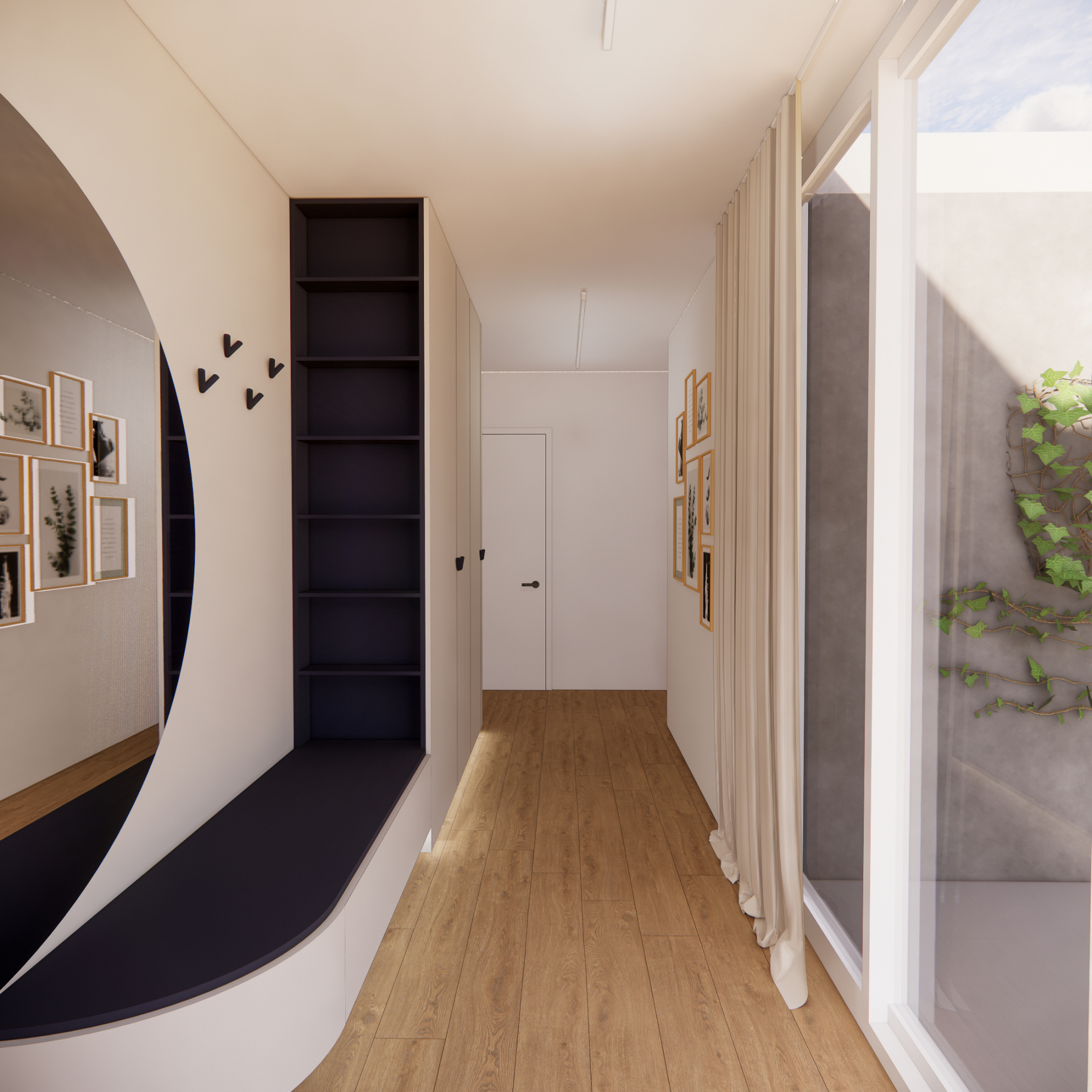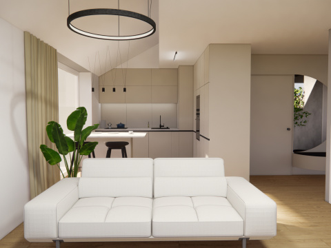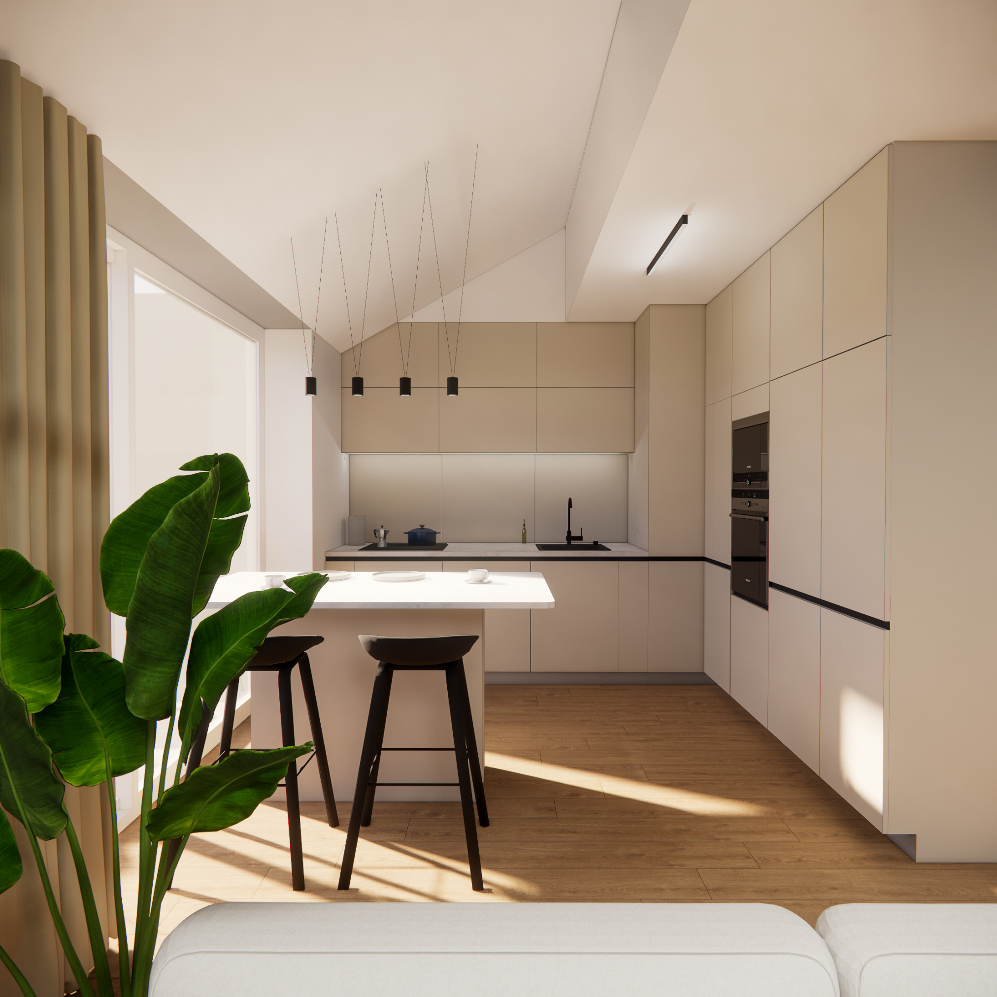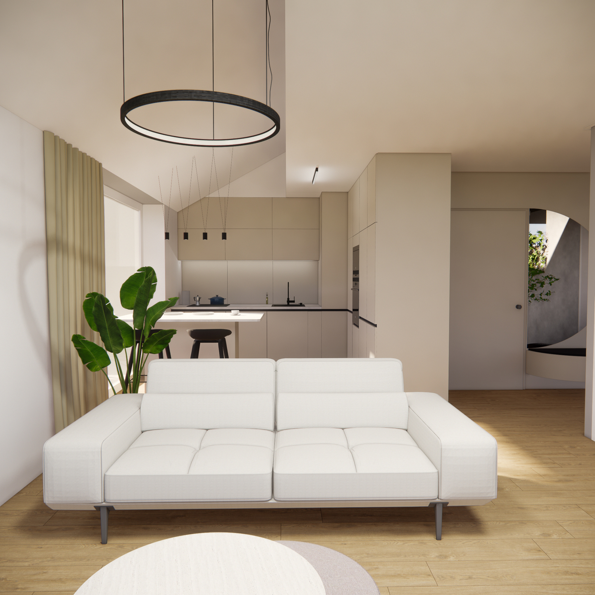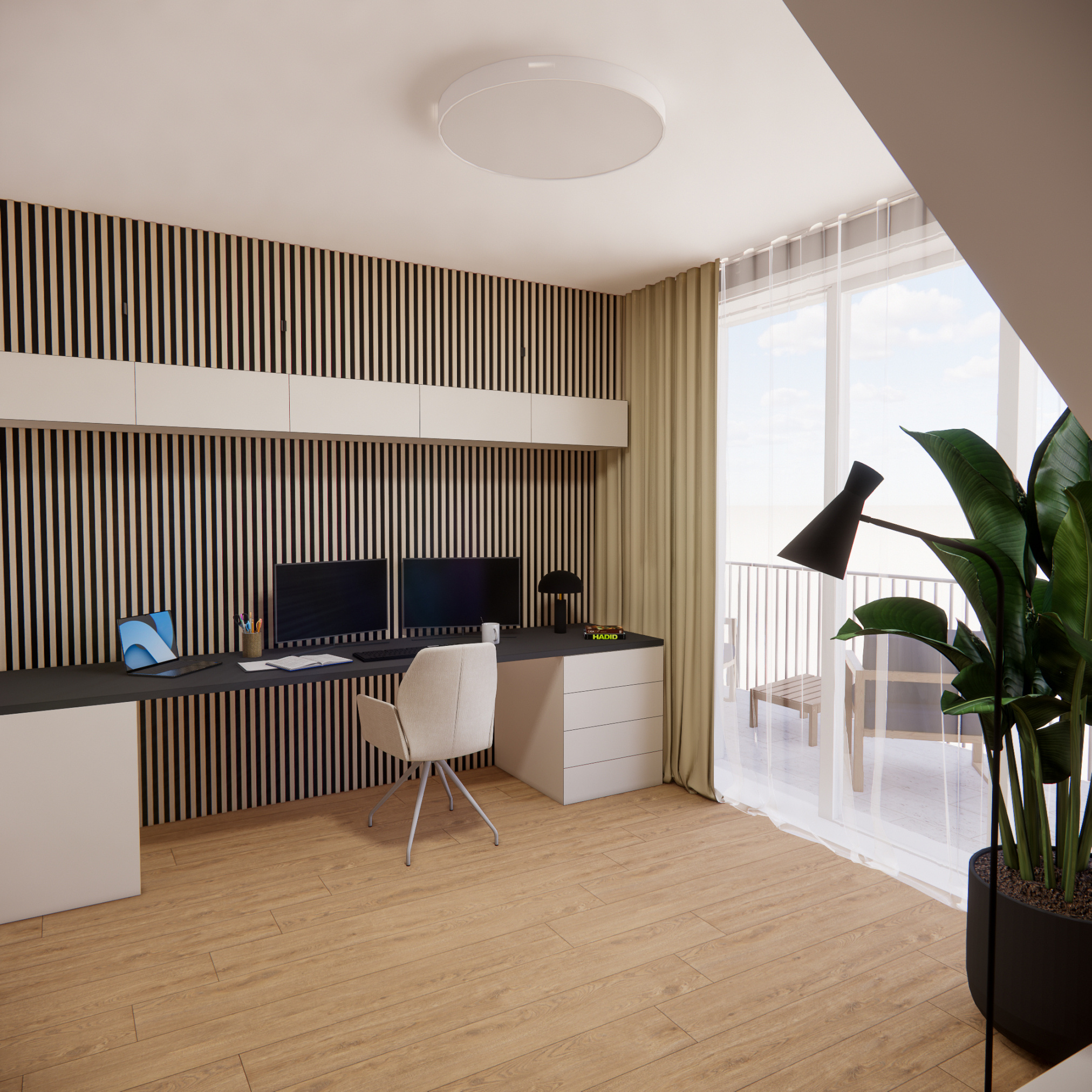 Moderný a odvážny byt pre mladý pár je navrhnutý s dôrazom na flexibilitu a atmosféru pokoja. Samostatná pracovňa sa dá jednoducho premeniť na hosťovskú alebo detskú izbu podľa potrieb obyvateľov. Obytný priestor s výhľadom na schodisko vedúce na strechu pôsobí harmonicky vďaka okolitej zeleni a vždyzeleným rastlinám, ktoré vytvárajú prirodzené súkromie. Práve tento priestor sa stáva živým srdcom celého bytu – miestom, kde sa spája dizajn, funkčnosť a pokoj.
