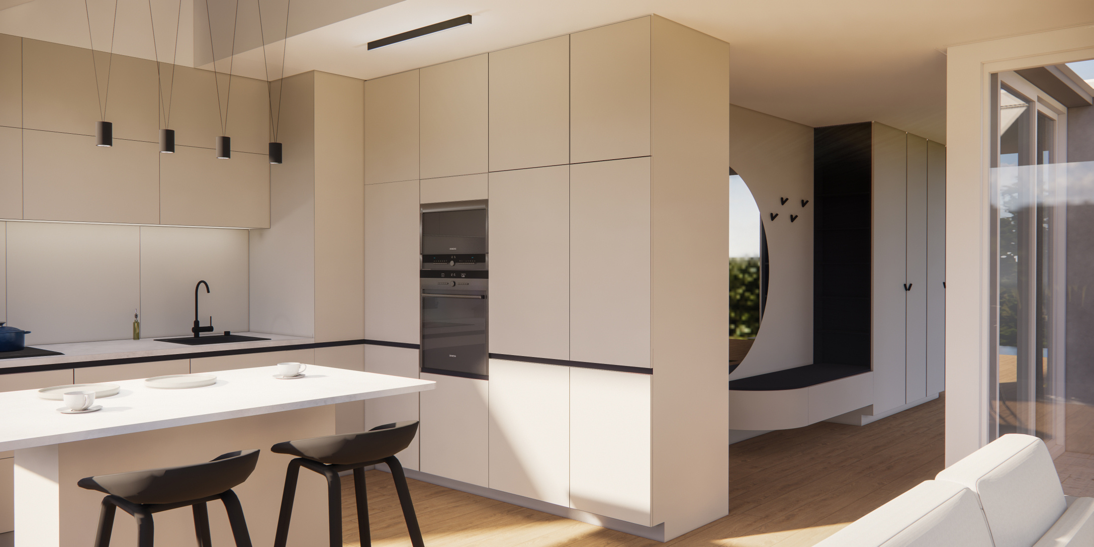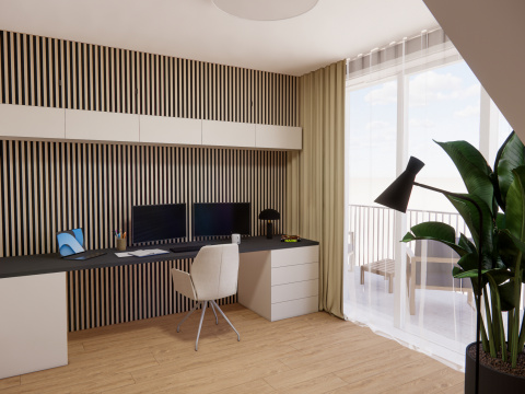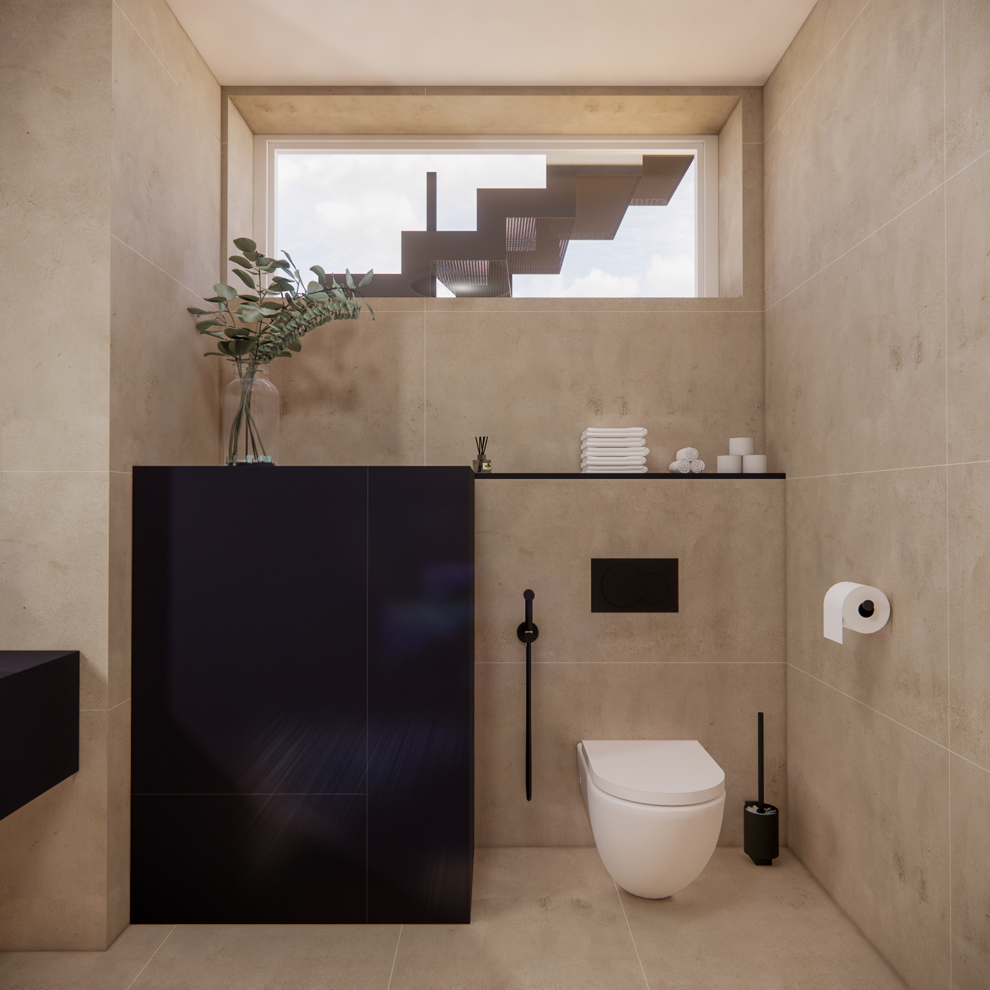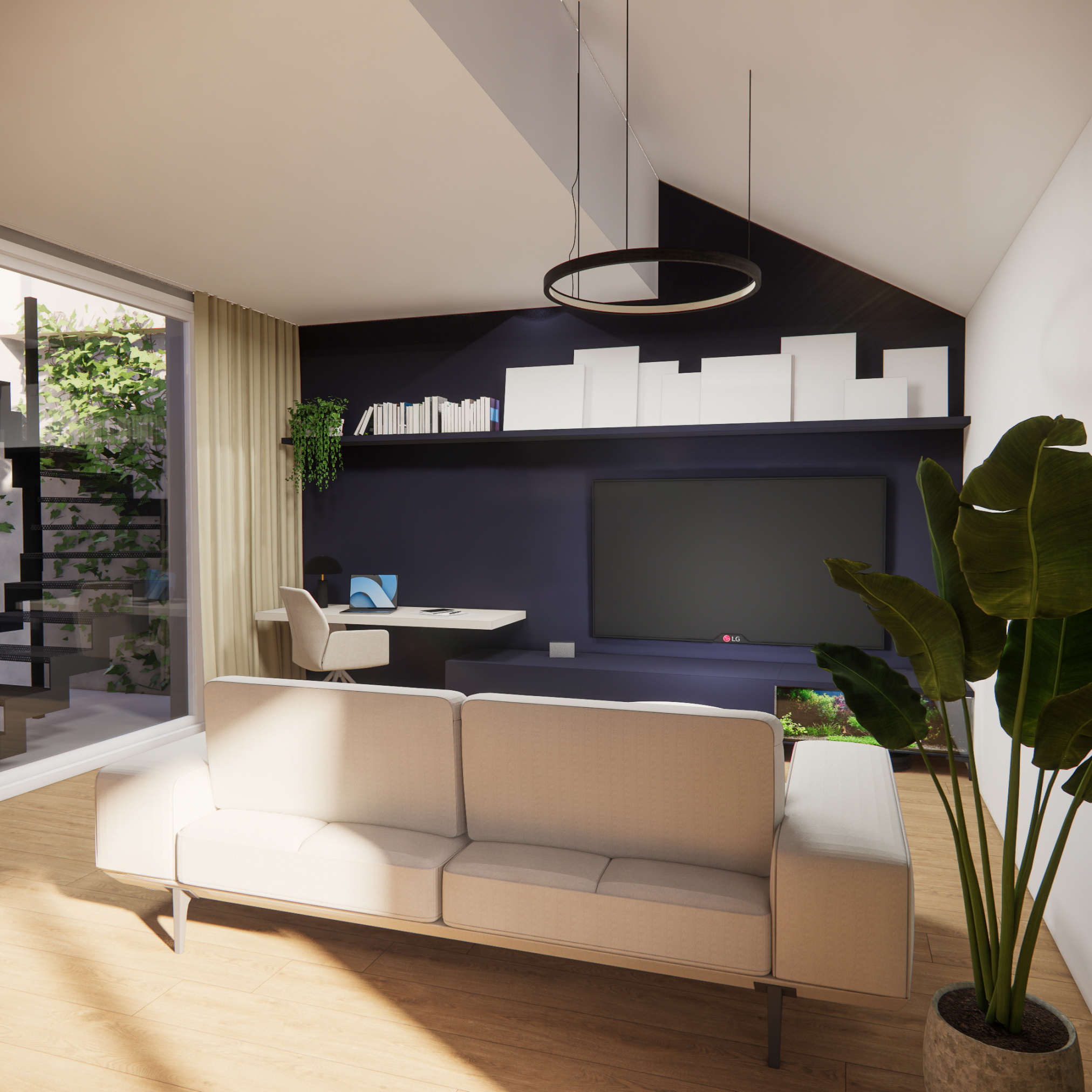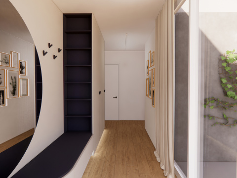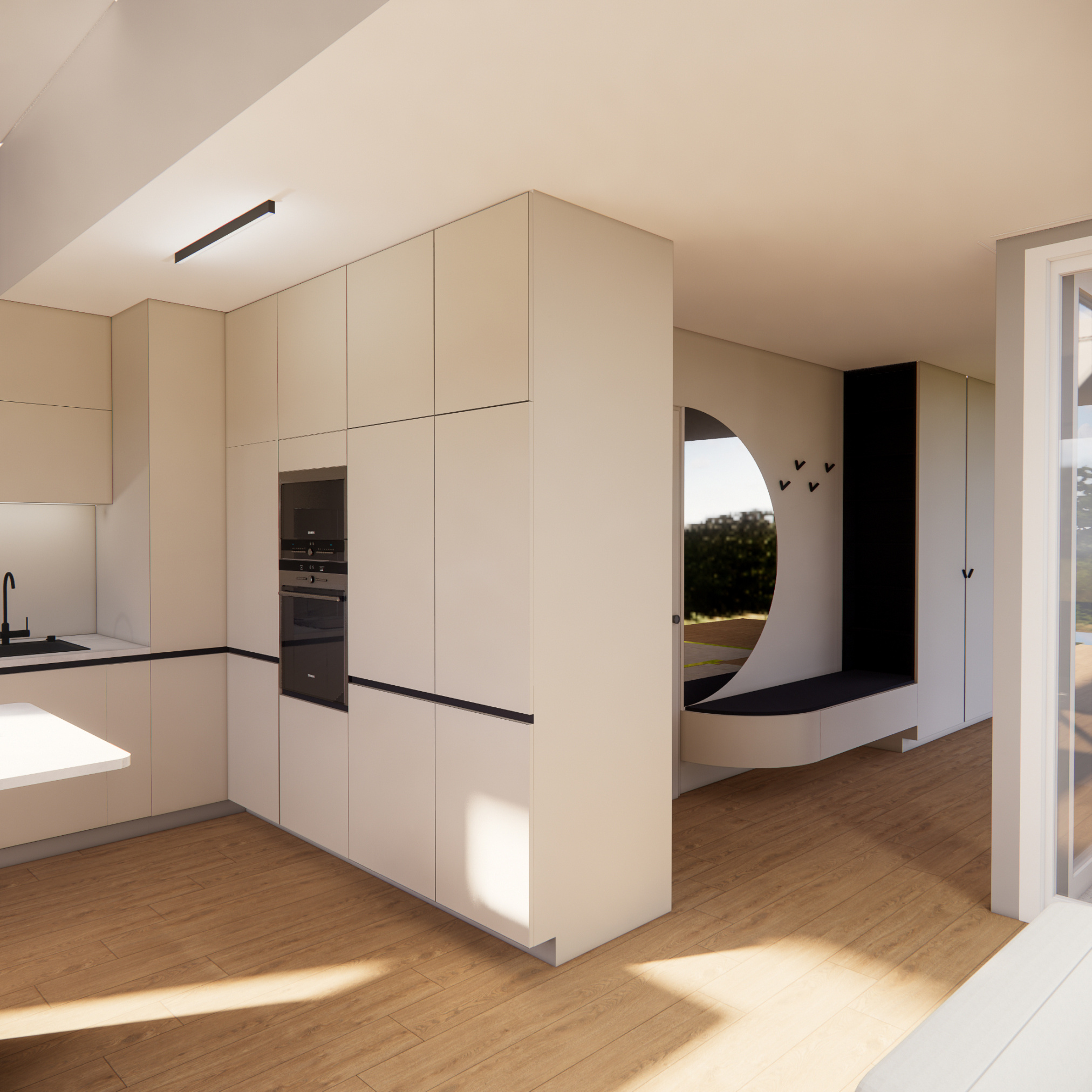 Moderný a odvážny byt pre mladý pár je navrhnutý s dôrazom na flexibilitu a atmosféru pokoja. Samostatná pracovňa sa dá jednoducho premeniť na hosťovskú alebo detskú izbu podľa potrieb obyvateľov. Obytný priestor s výhľadom na schodisko vedúce na strechu pôsobí harmonicky vďaka okolitej zeleni a vždyzeleným rastlinám, ktoré vytvárajú prirodzené súkromie. Práve tento priestor sa stáva živým srdcom celého bytu – miestom, kde sa spája dizajn, funkčnosť a pokoj.