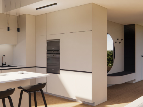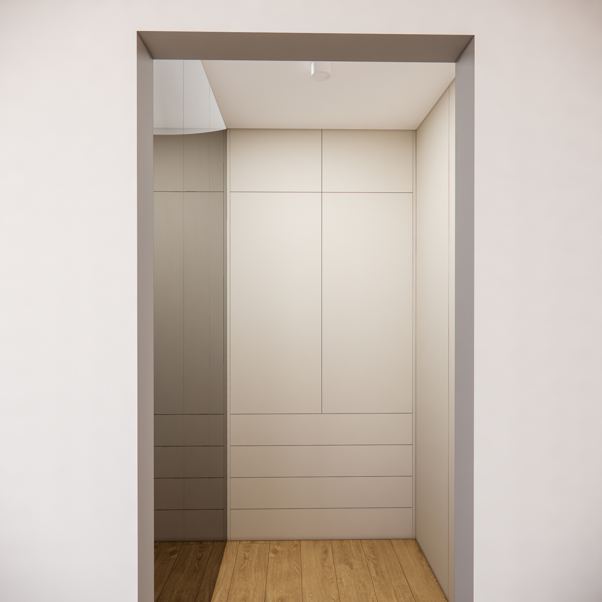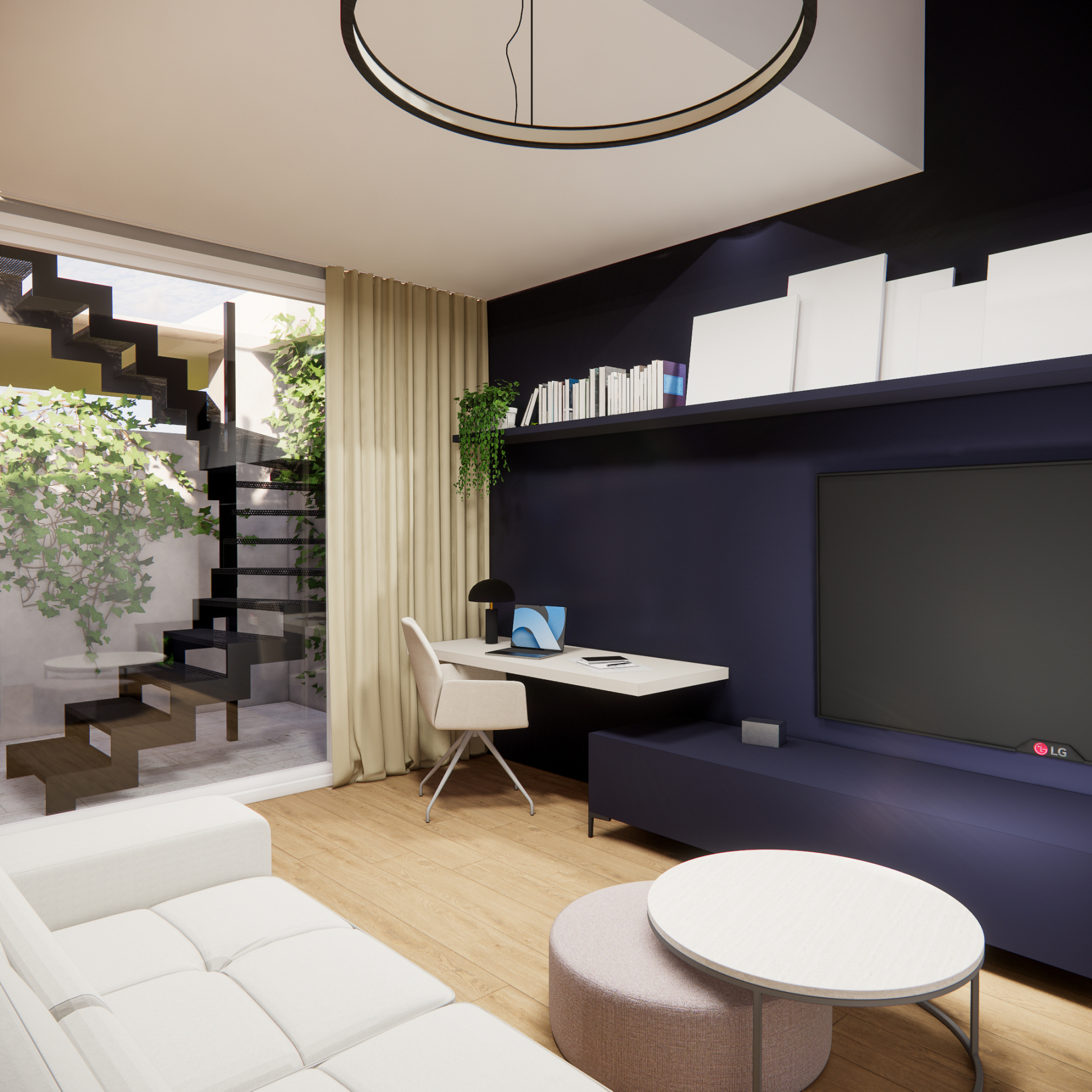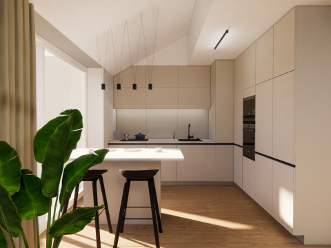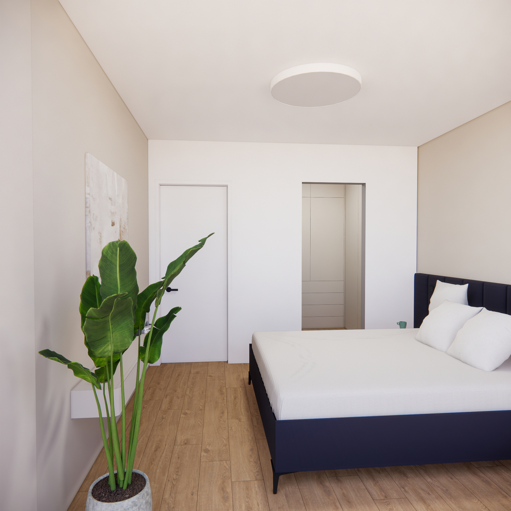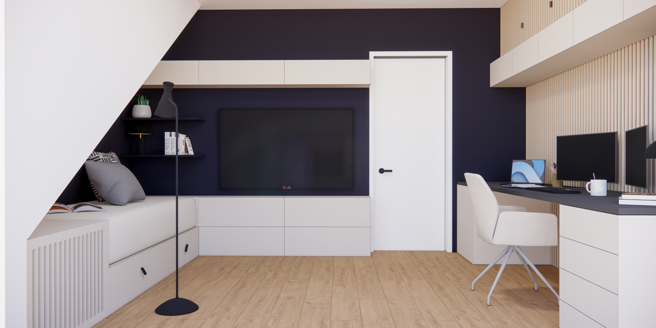 Moderný a odvážny byt pre mladý pár je navrhnutý s dôrazom na flexibilitu a atmosféru pokoja. Samostatná pracovňa sa dá jednoducho premeniť na hosťovskú alebo detskú izbu podľa potrieb obyvateľov. Obytný priestor s výhľadom na schodisko vedúce na strechu pôsobí harmonicky vďaka okolitej zeleni a vždyzeleným rastlinám, ktoré vytvárajú prirodzené súkromie. Práve tento priestor sa stáva živým srdcom celého bytu – miestom, kde sa spája dizajn, funkčnosť a pokoj.