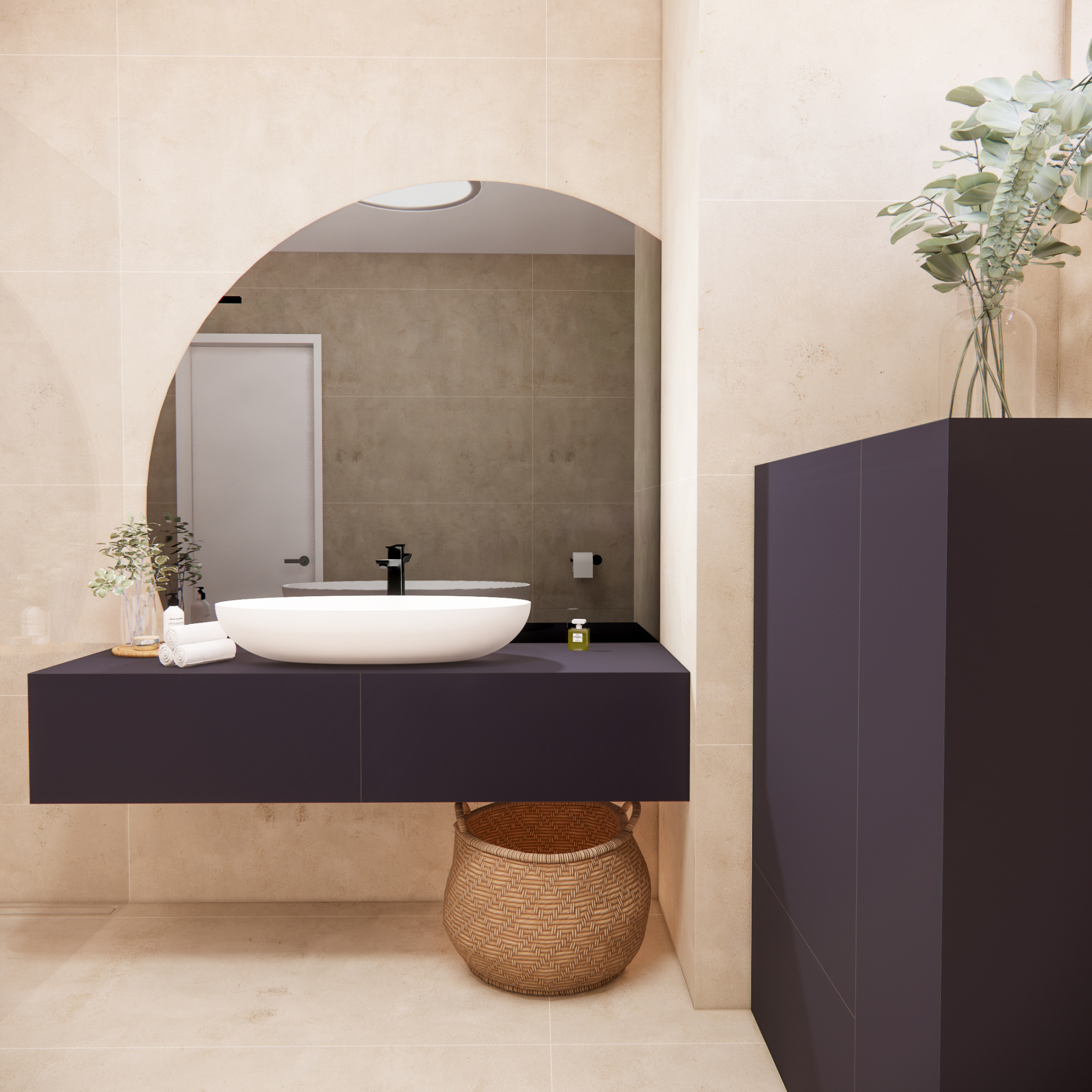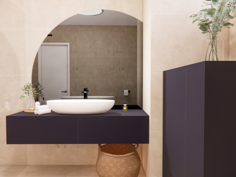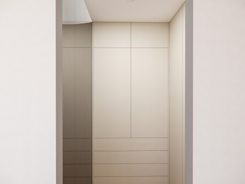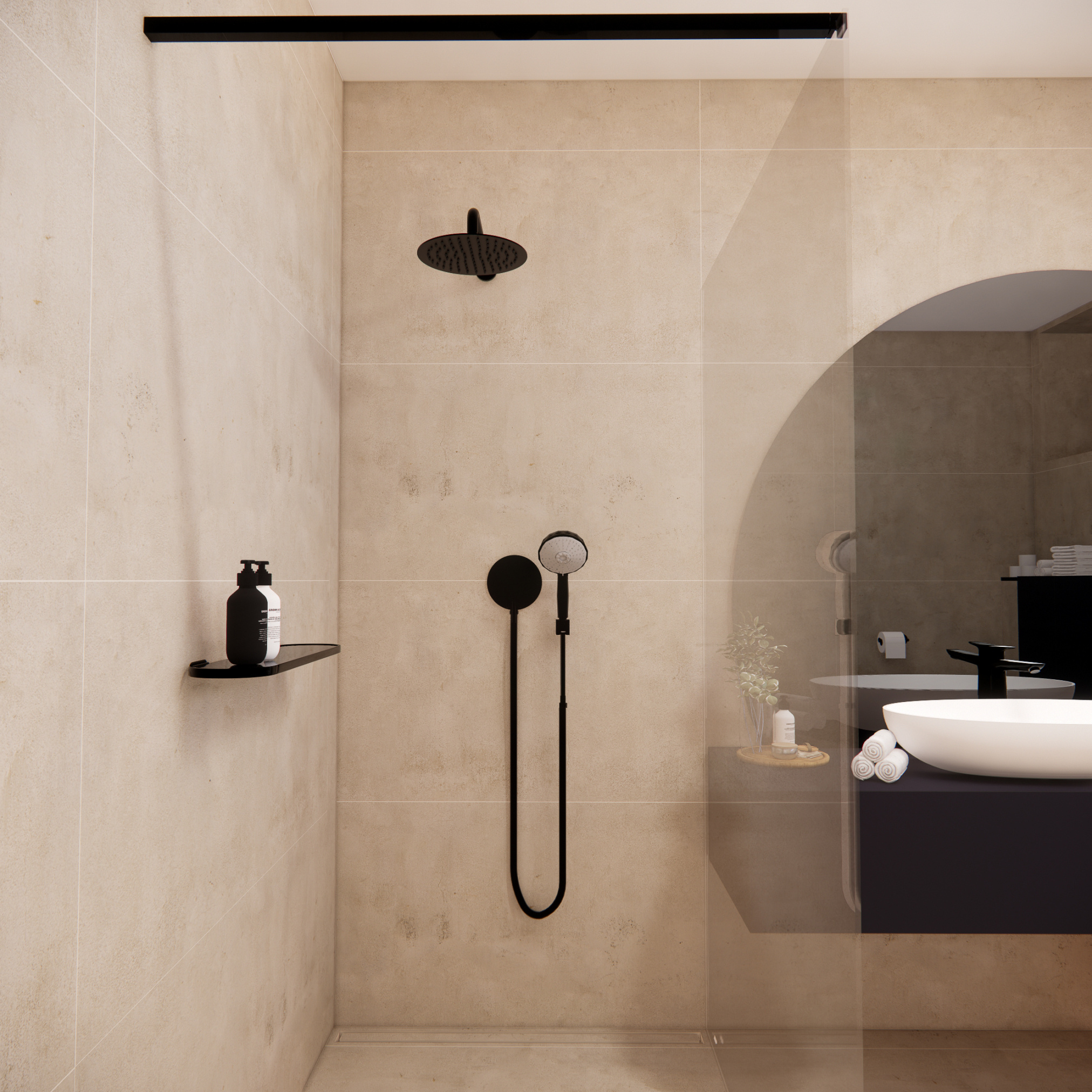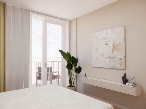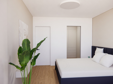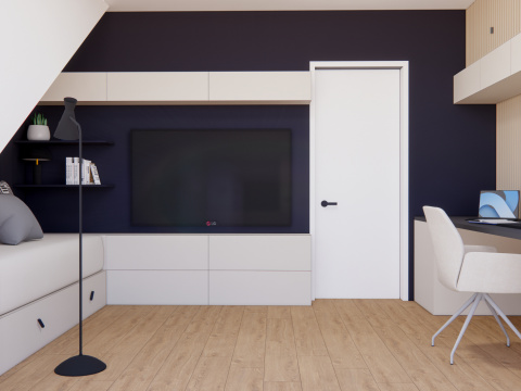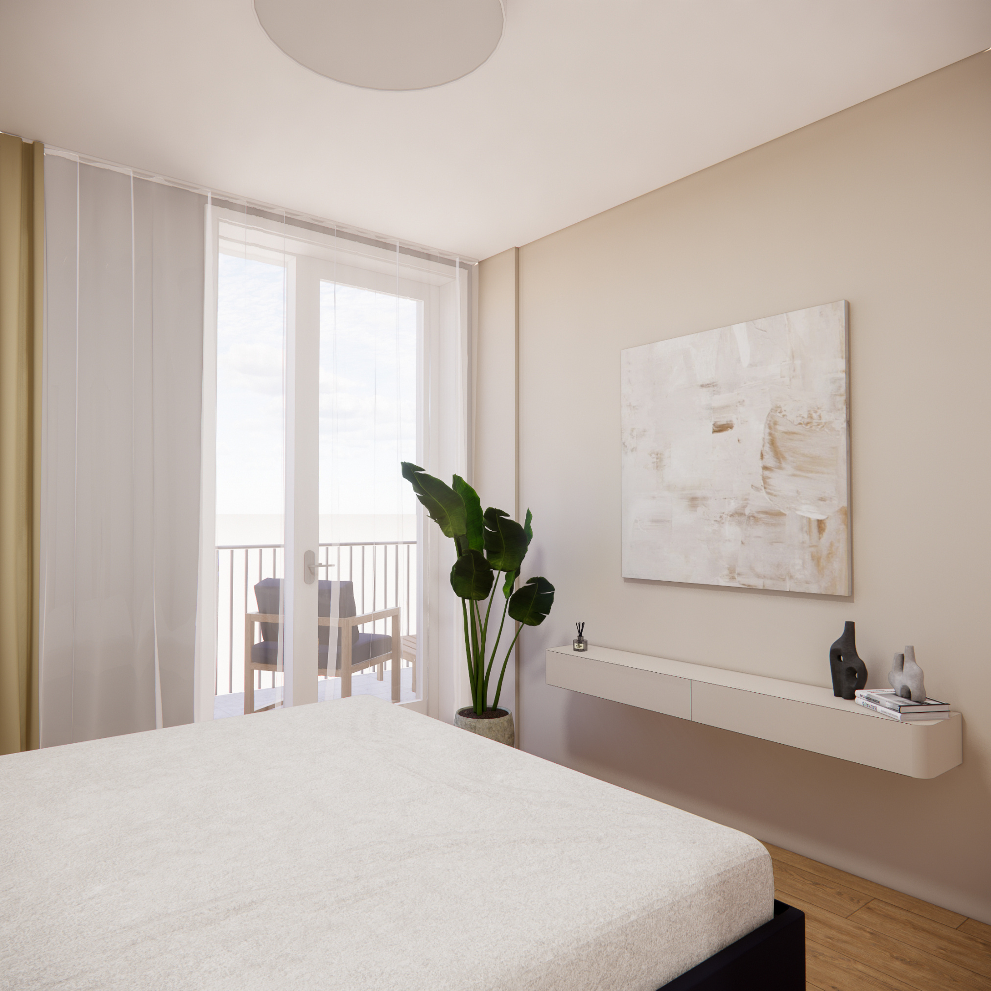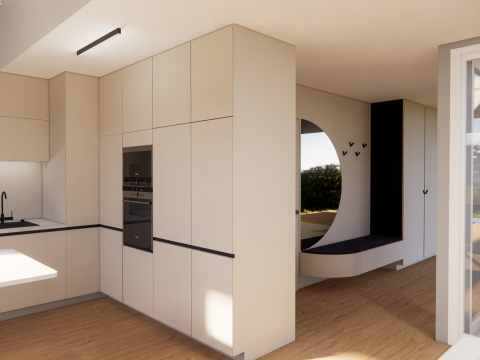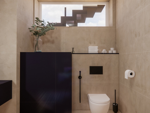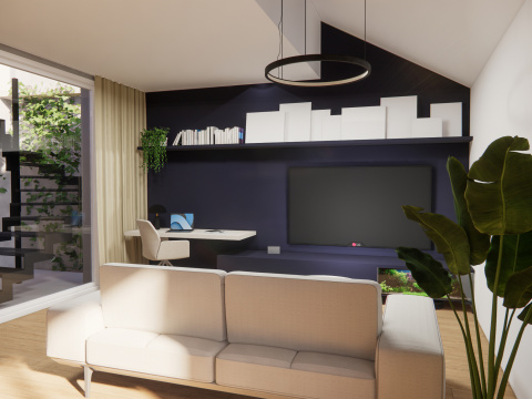 Moderný a odvážny byt pre mladý pár je navrhnutý s dôrazom na flexibilitu a atmosféru pokoja. Samostatná pracovňa sa dá jednoducho premeniť na hosťovskú alebo detskú izbu podľa potrieb obyvateľov. Obytný priestor s výhľadom na schodisko vedúce na strechu pôsobí harmonicky vďaka okolitej zeleni a vždyzeleným rastlinám, ktoré vytvárajú prirodzené súkromie. Práve tento priestor sa stáva živým srdcom celého bytu – miestom, kde sa spája dizajn, funkčnosť a pokoj.