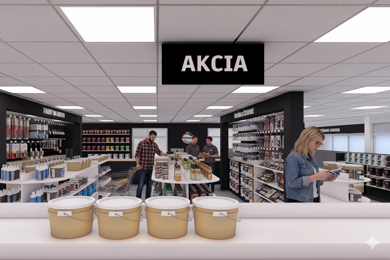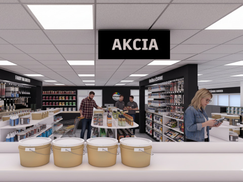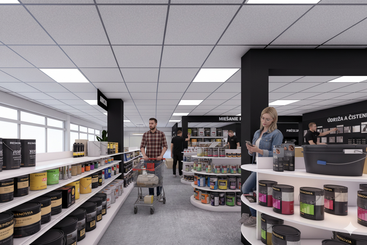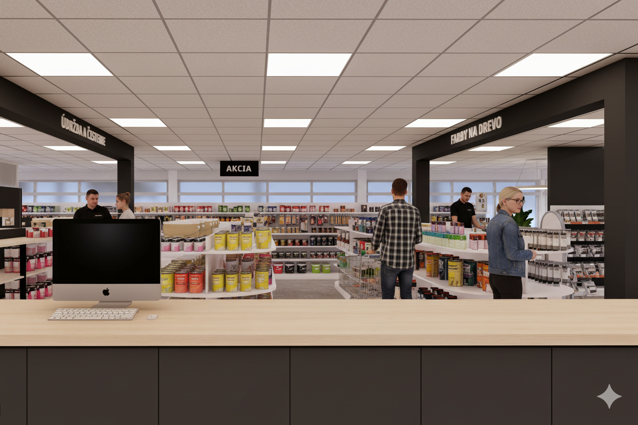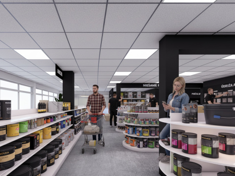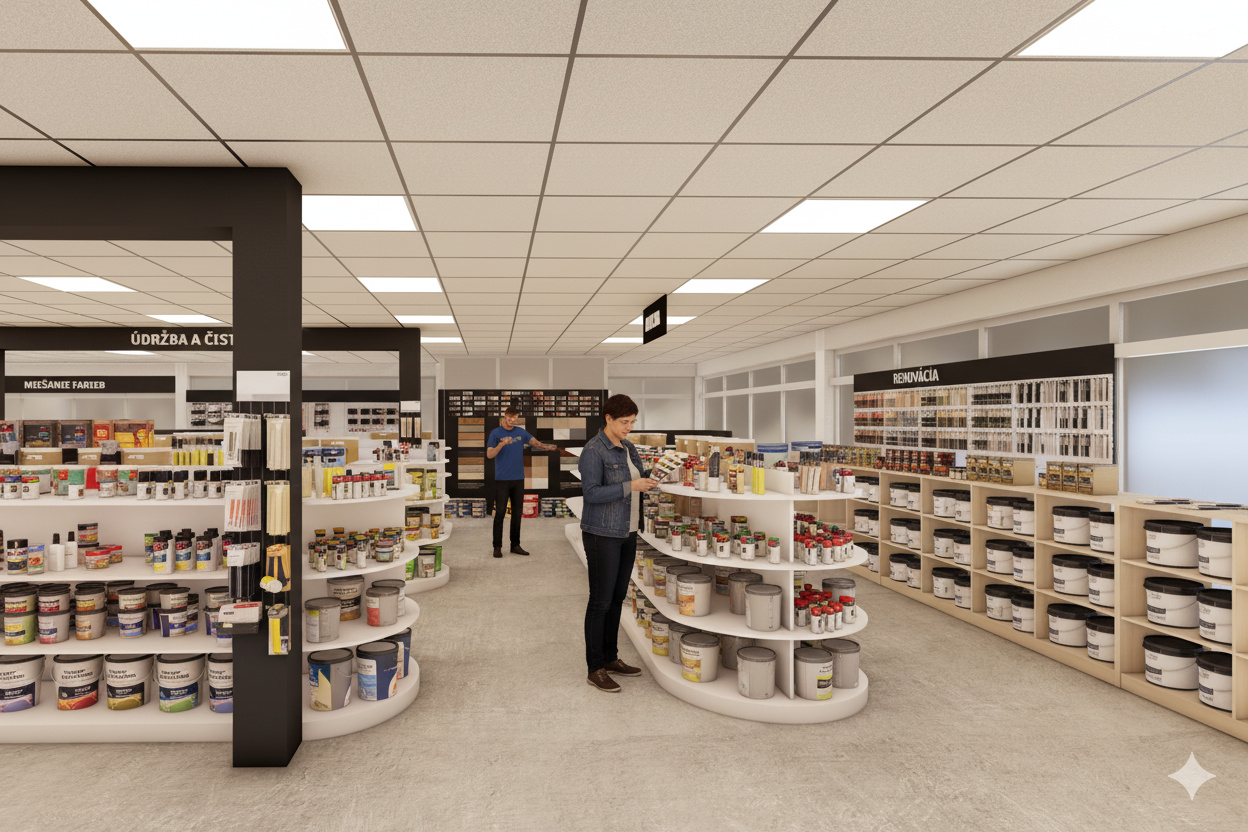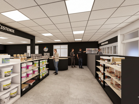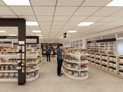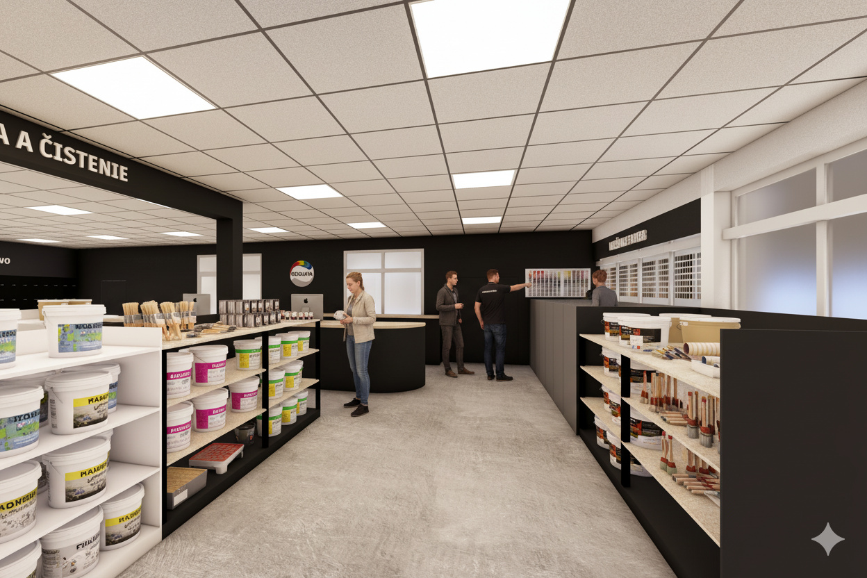 Návrh rieši interiér predajne farieb, stavebnej chémie a príslušenstva, so zameraním na funkčné a estetické usporiadanie priestoru. Súčasťou riešenia je návrh pokladne, regálov a vystavovacích plôch. Interiér je ladený v kontrastných farbách, ktoré dodávajú priestoru energiu a dynamiku. Výsledkom je moderná, prehľadná a usporiadaná predajňa s dôrazom na komfort zákazníkov aj personálu.