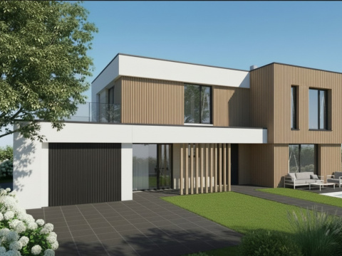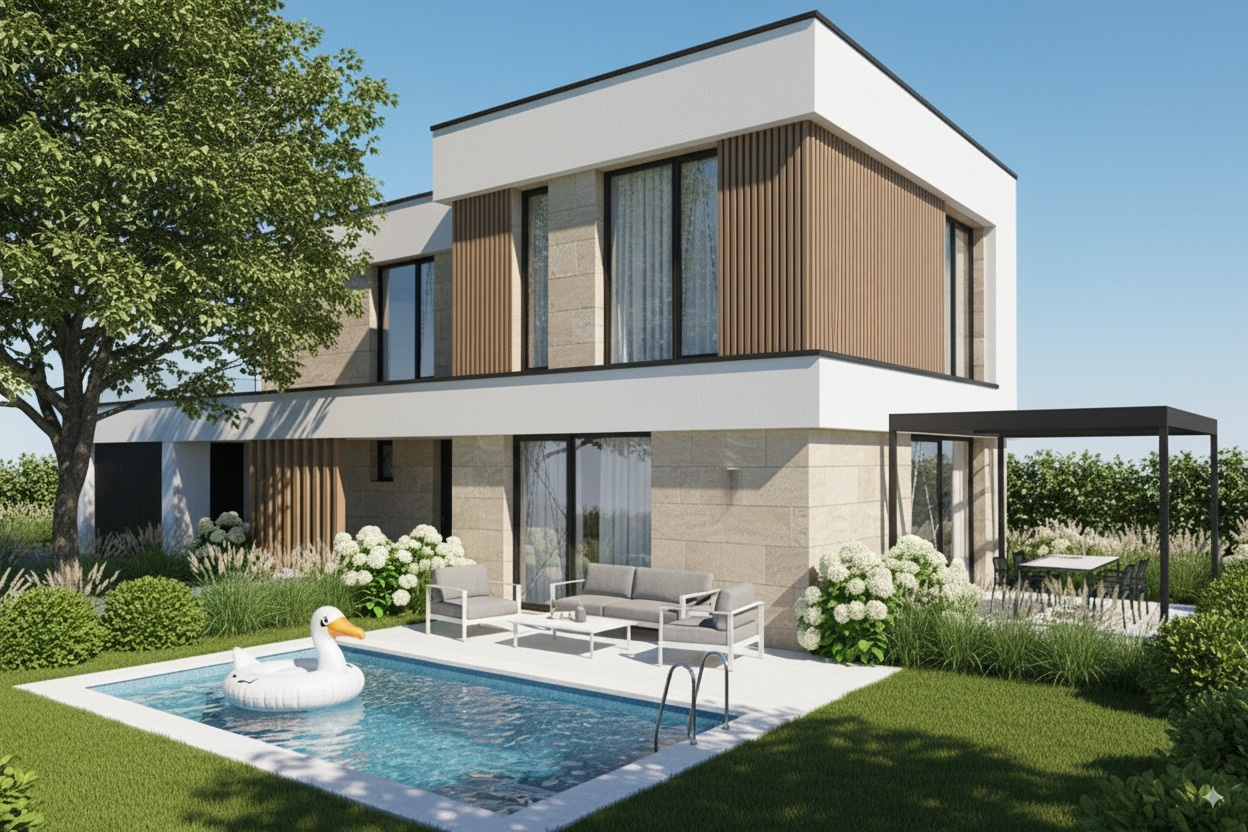 Moderná architektúra zasadená do mierne svahovitého terénu pod okrajom lesa. Dom je navrhnutý s dôrazom na maximálne využitie menšieho pozemku – funkčné dispozície plynule prepájajú interiér s exteriérom. Obytný priestor sa otvára do záhrady s terasou a bazénom, ktoré prinášajú pocit súkromia a prepojenia s prírodou. Jednoduché línie, prírodné materiály a prepracované detaily dotvárajú harmonický celok reagujúci na prostredie aj potreby modernej rodiny.