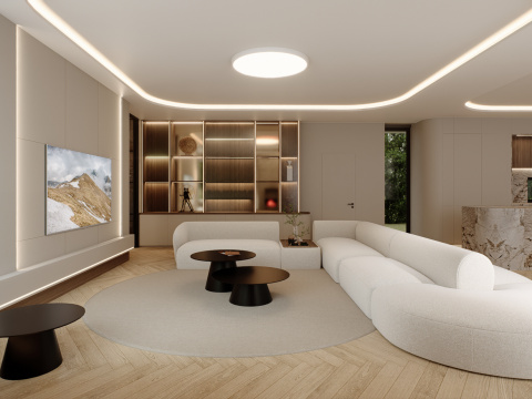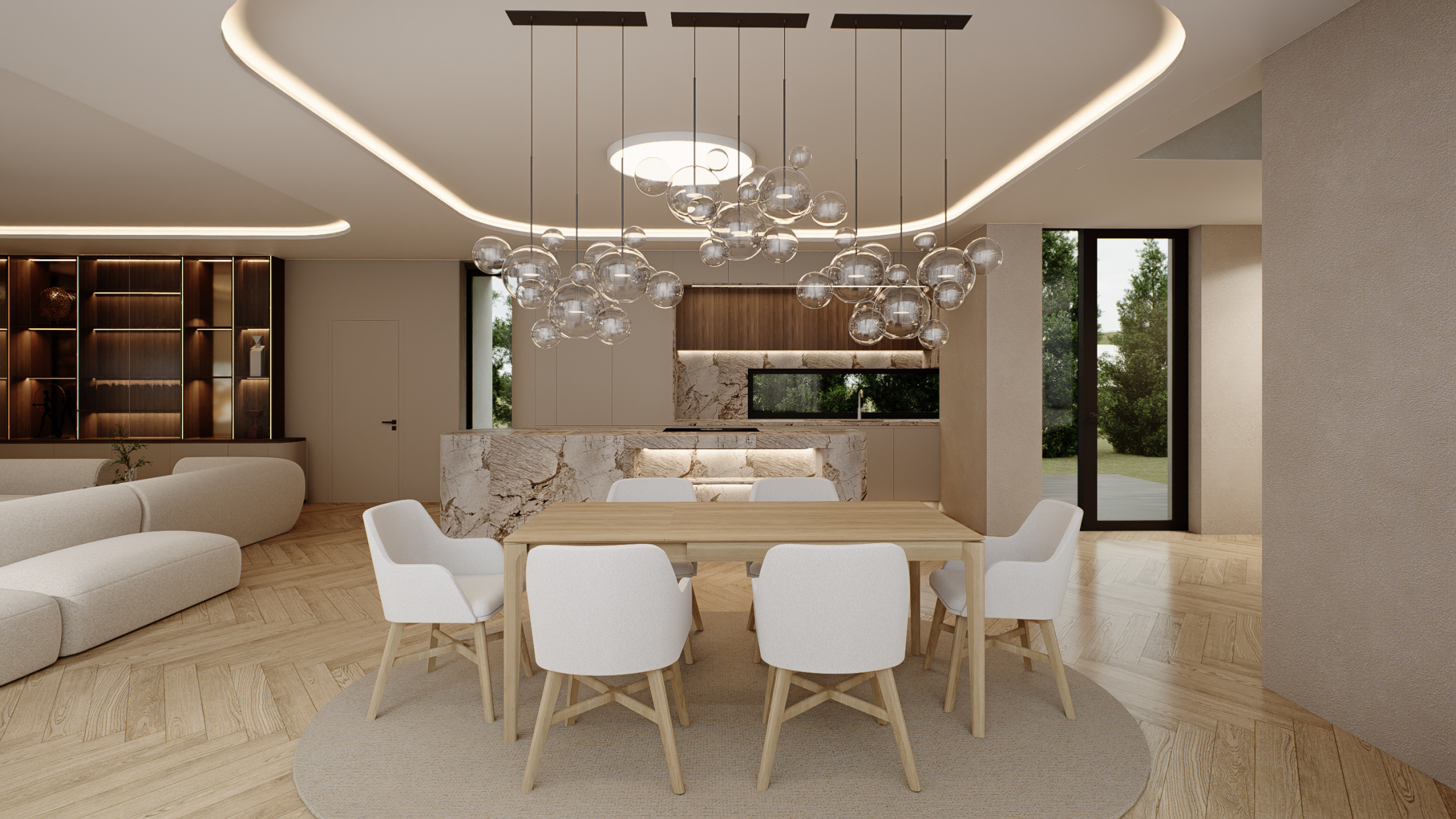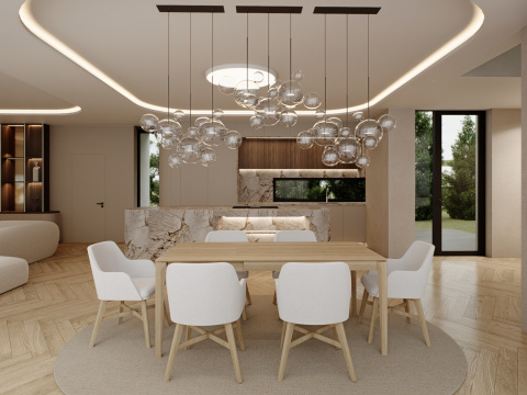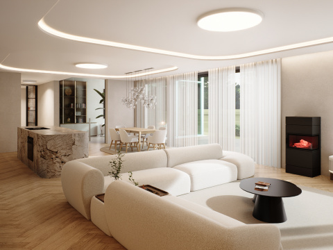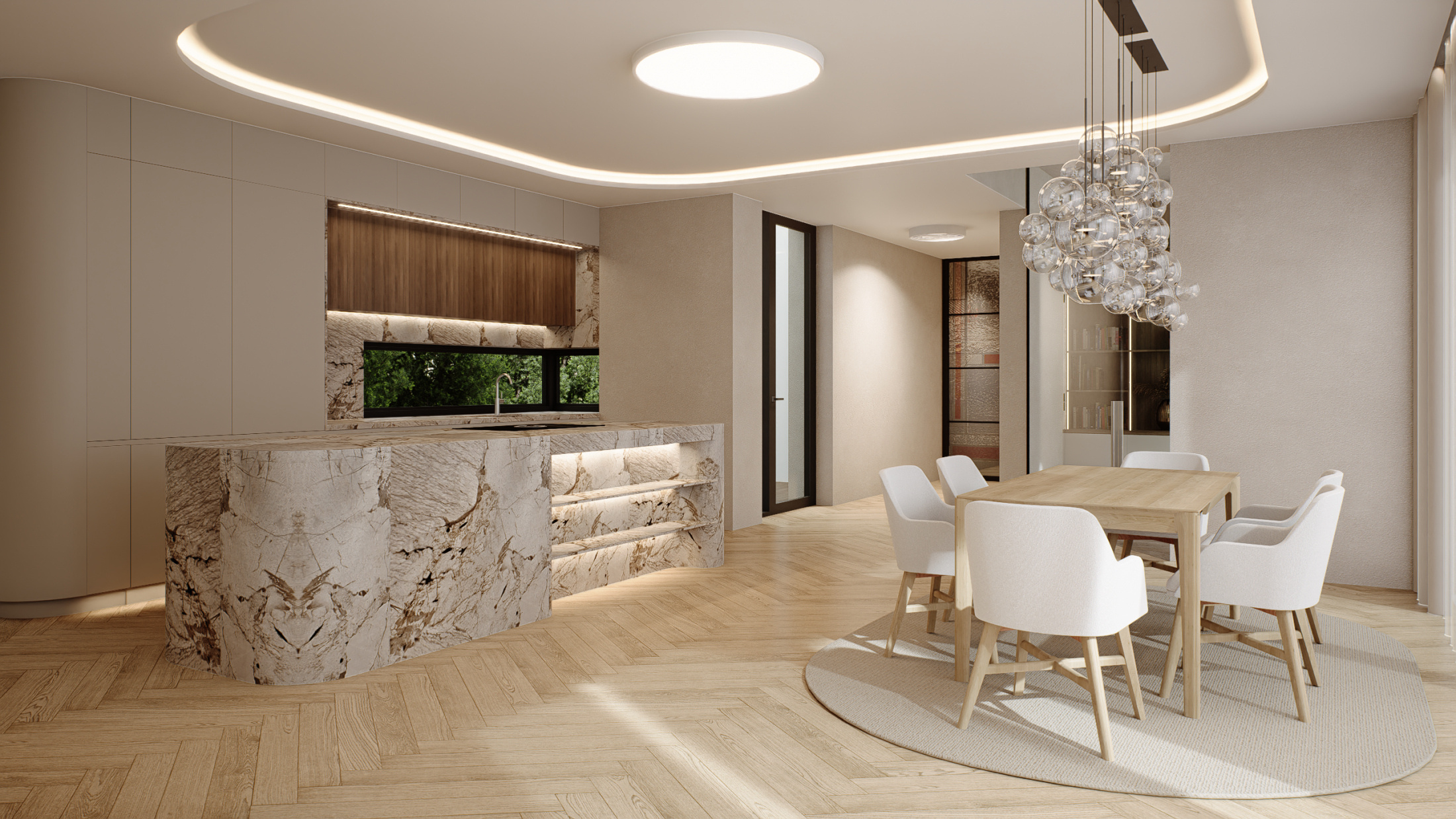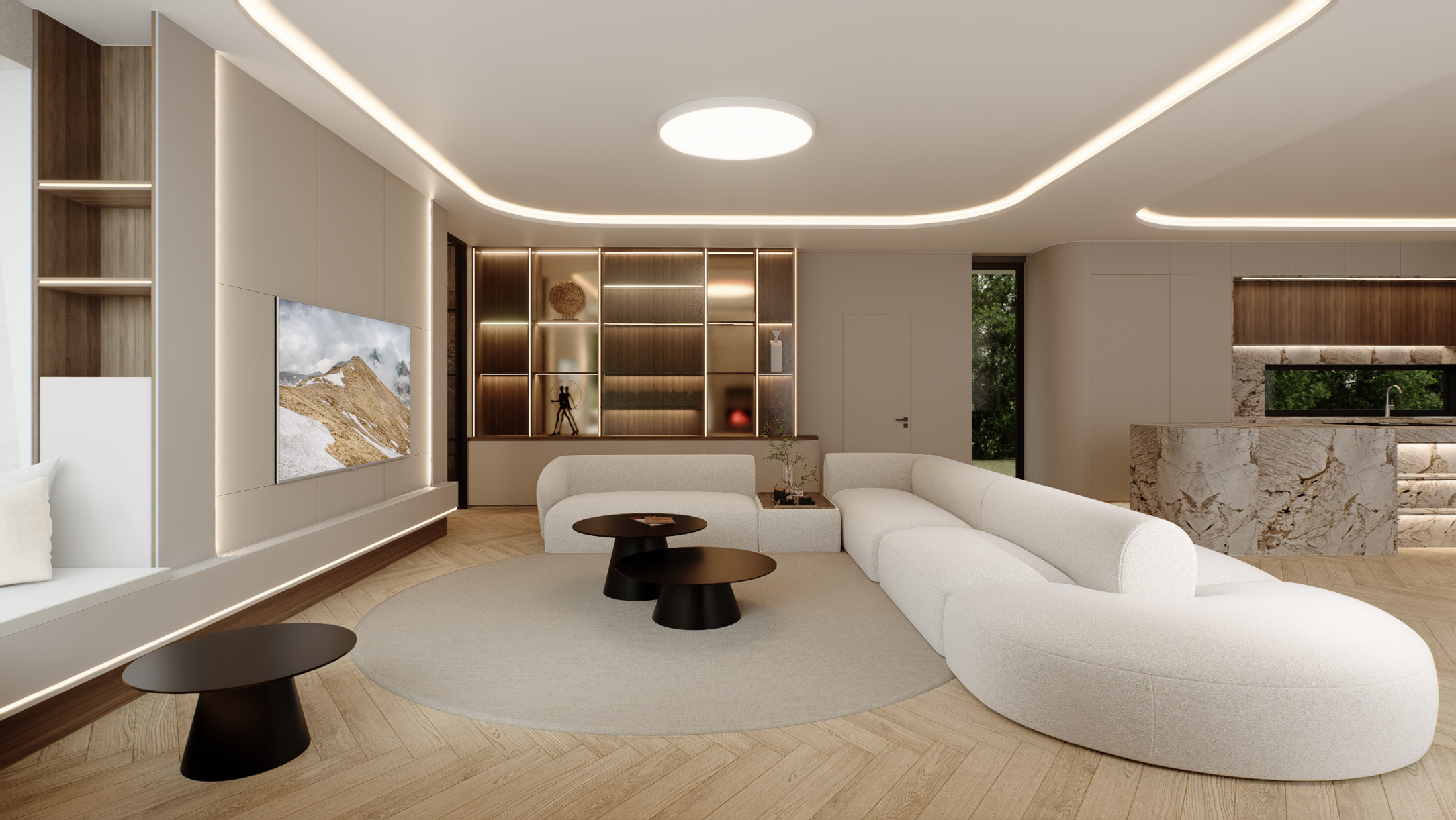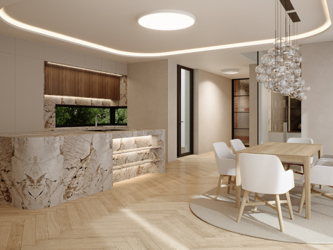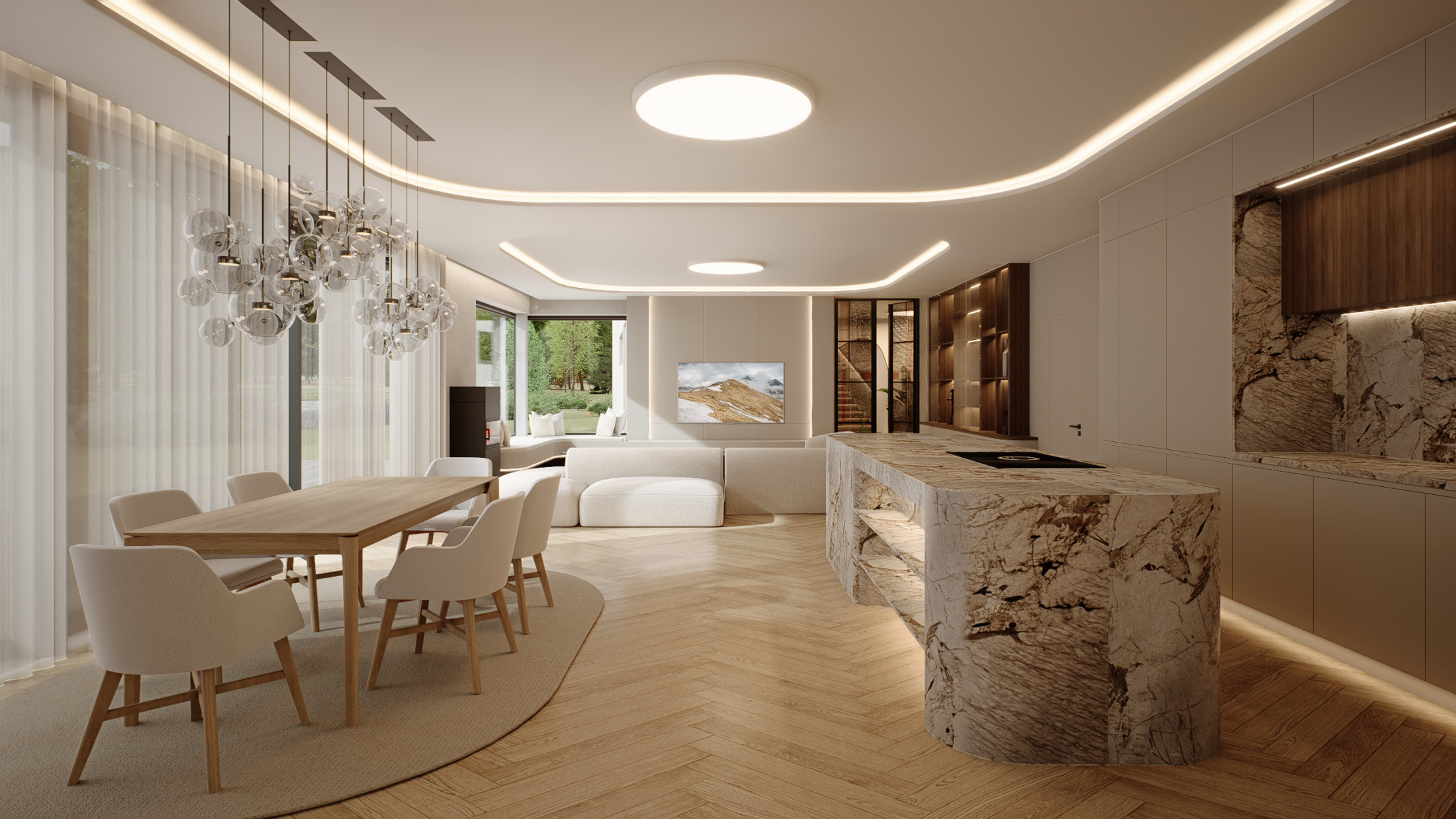 Interiér rodinného domu v Lomnici vznikol ako výsledok tvorivej spolupráce s klientom, v ktorej sme zasiahli aj do dispozičného riešenia a detailov konceptu. Priestor spája elegantný minimalizmus s výraznými materiálmi a hrou oblých a ostrých línií, čím vzniká harmonický, no dynamický celok. Dominantou sa stal prírodný kameň, ktorý podčiarkuje originalitu interiéru a nadčasový charakter. Návrh prepája interiér s panorámou Tatier, pričom denná zóna podporuje spoločný život a nočná prináša pokoj a kontakt s prírodou.