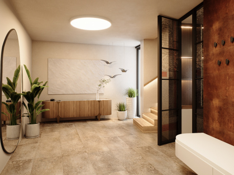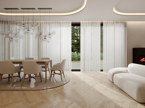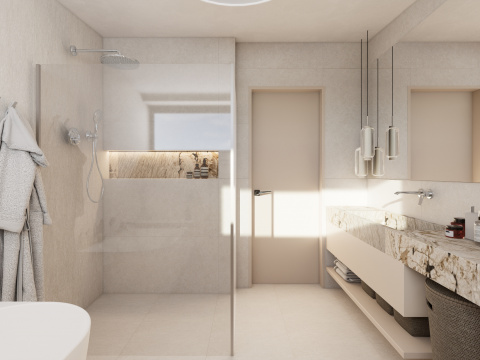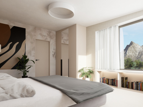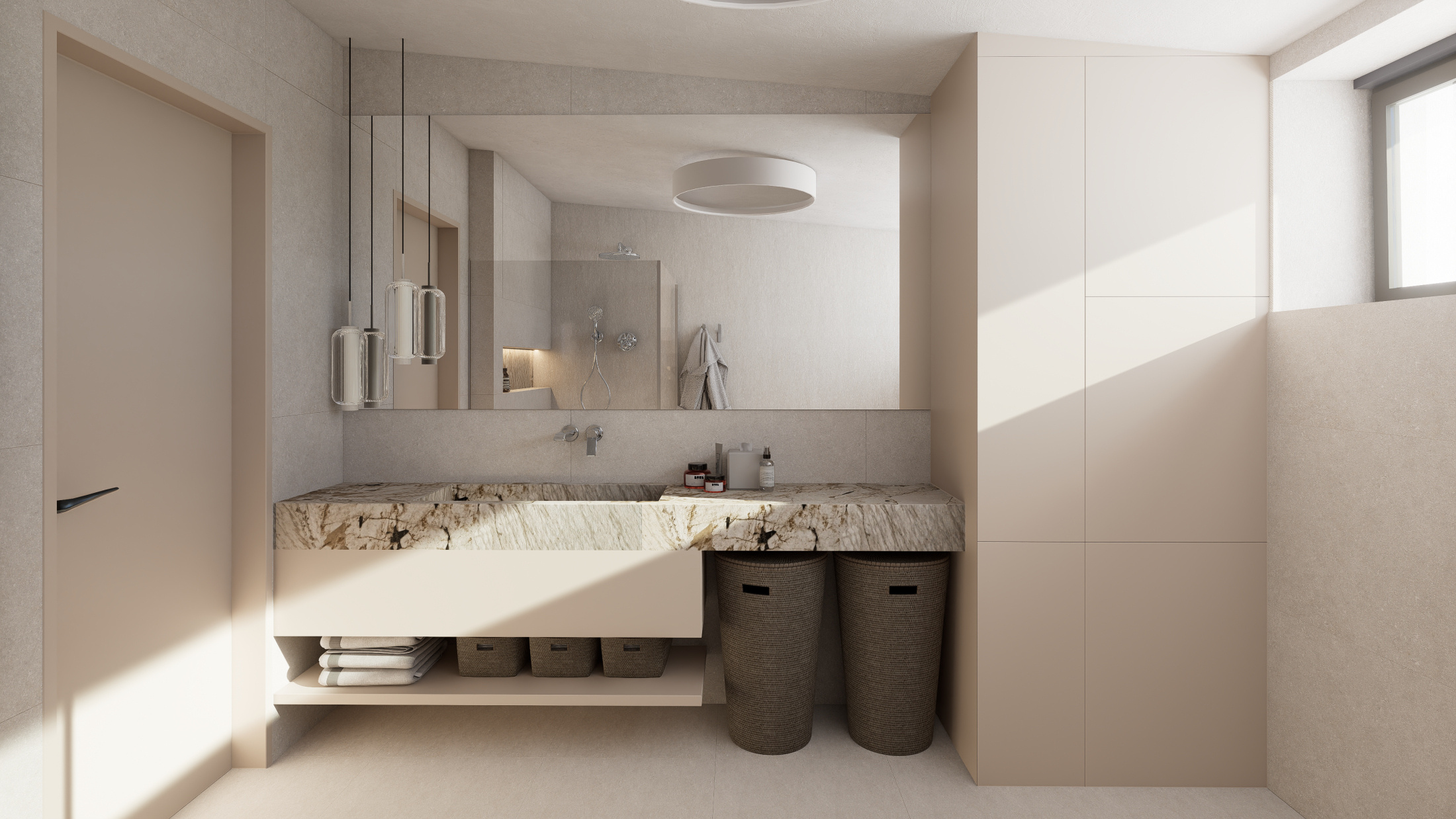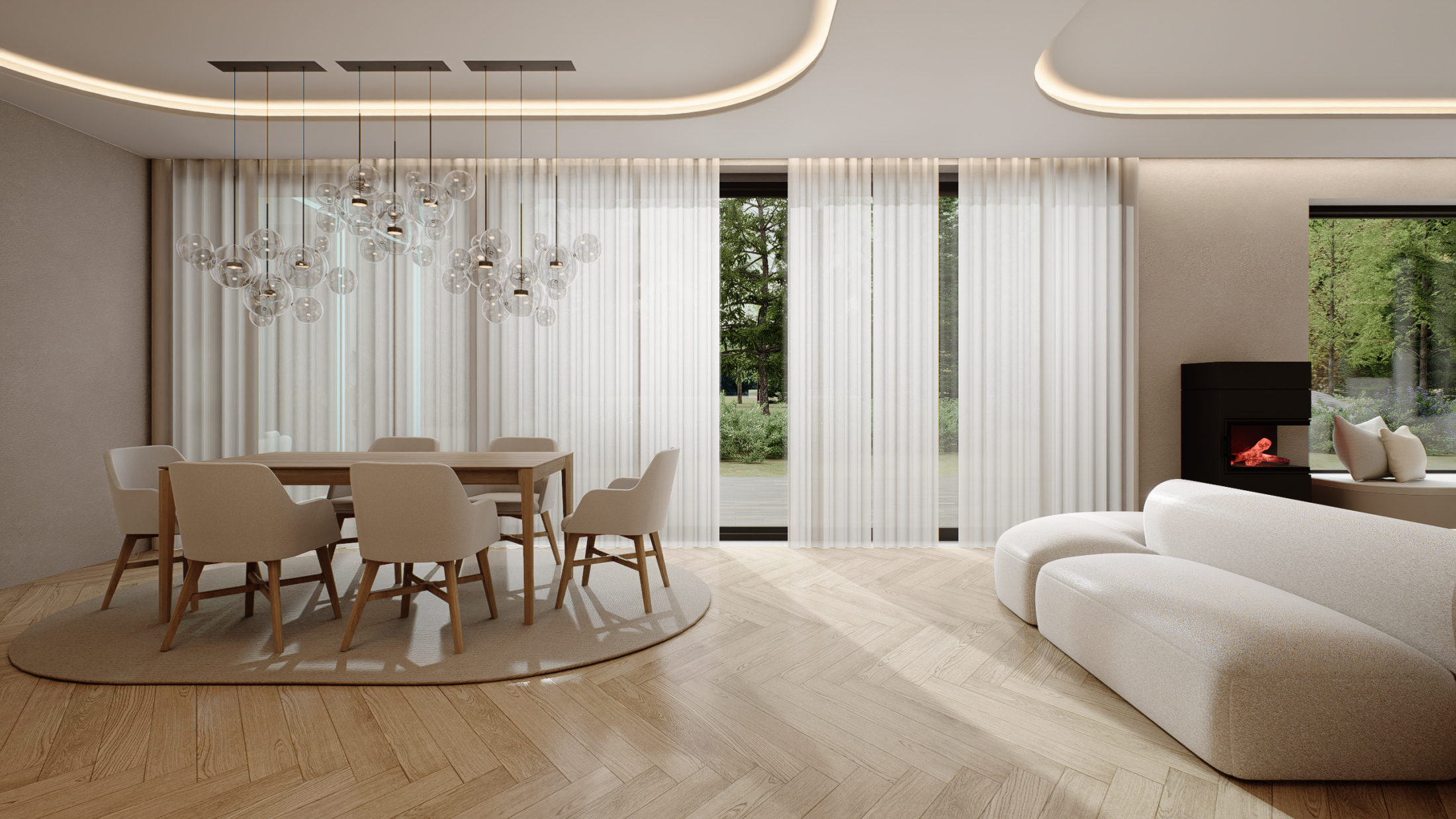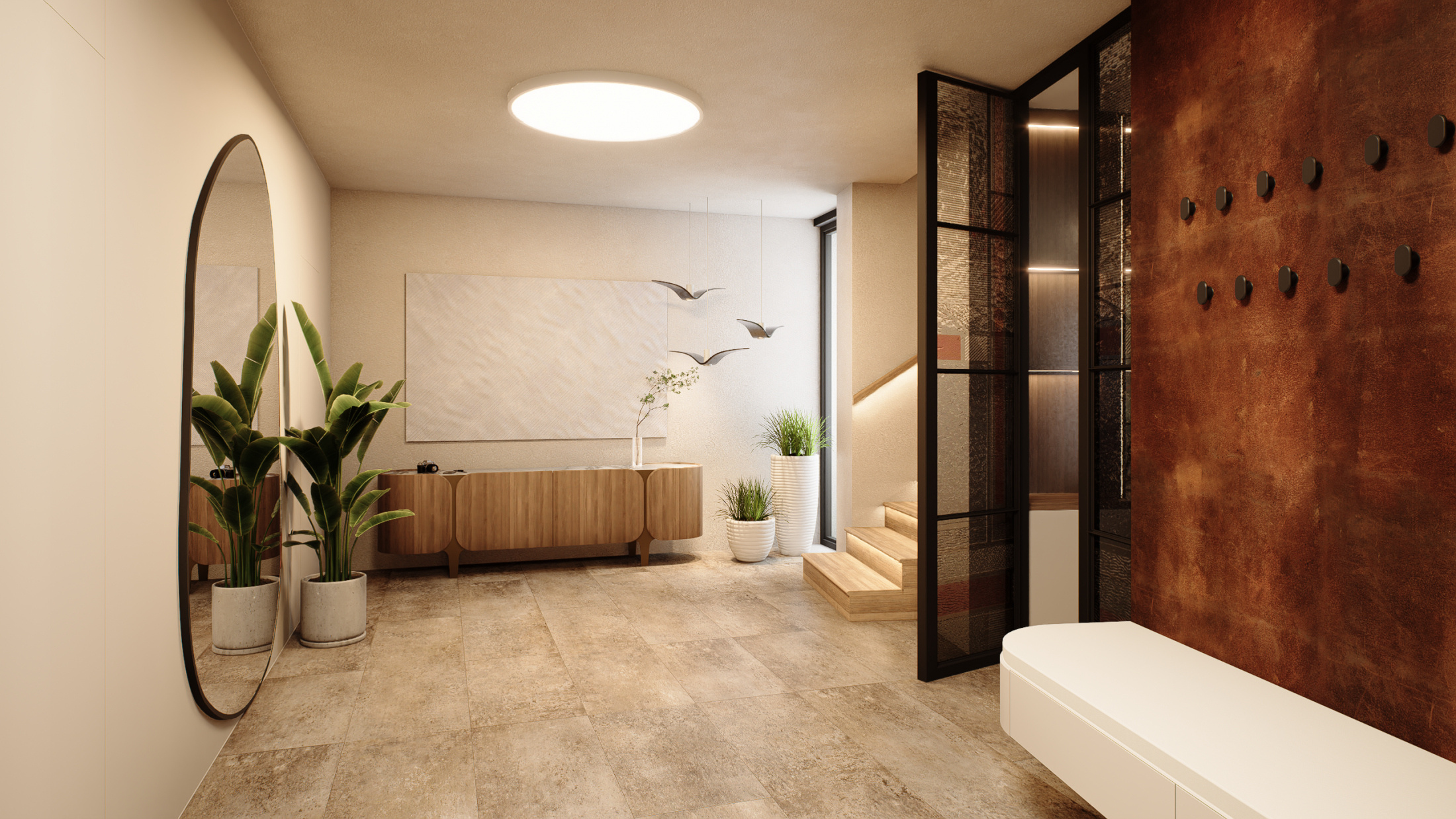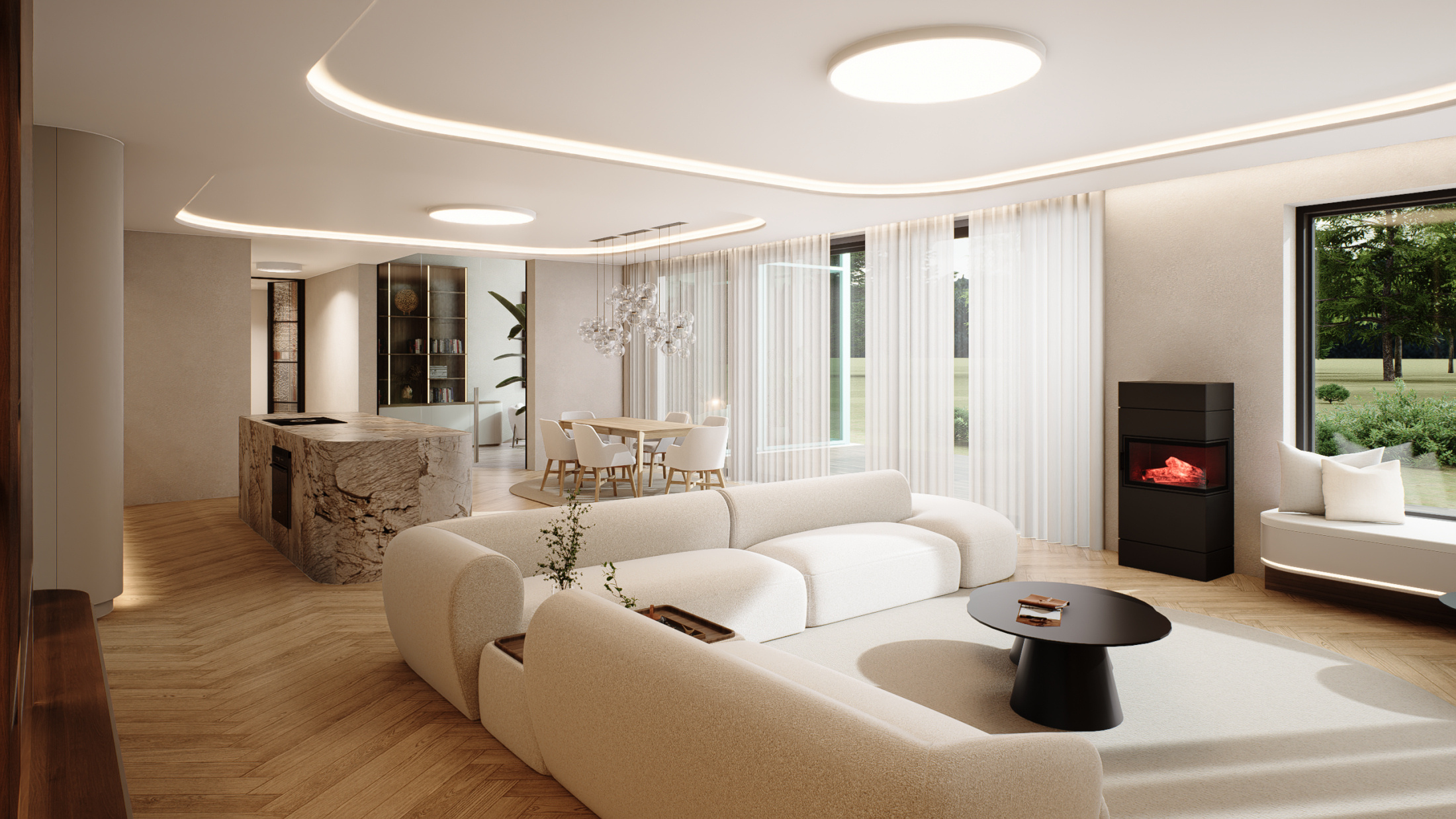 Interiér rodinného domu v Lomnici vznikol ako výsledok tvorivej spolupráce s klientom, v ktorej sme zasiahli aj do dispozičného riešenia a detailov konceptu. Priestor spája elegantný minimalizmus s výraznými materiálmi a hrou oblých a ostrých línií, čím vzniká harmonický, no dynamický celok. Dominantou sa stal prírodný kameň, ktorý podčiarkuje originalitu interiéru a nadčasový charakter. Návrh prepája interiér s panorámou Tatier, pričom denná zóna podporuje spoločný život a nočná prináša pokoj a kontakt s prírodou.